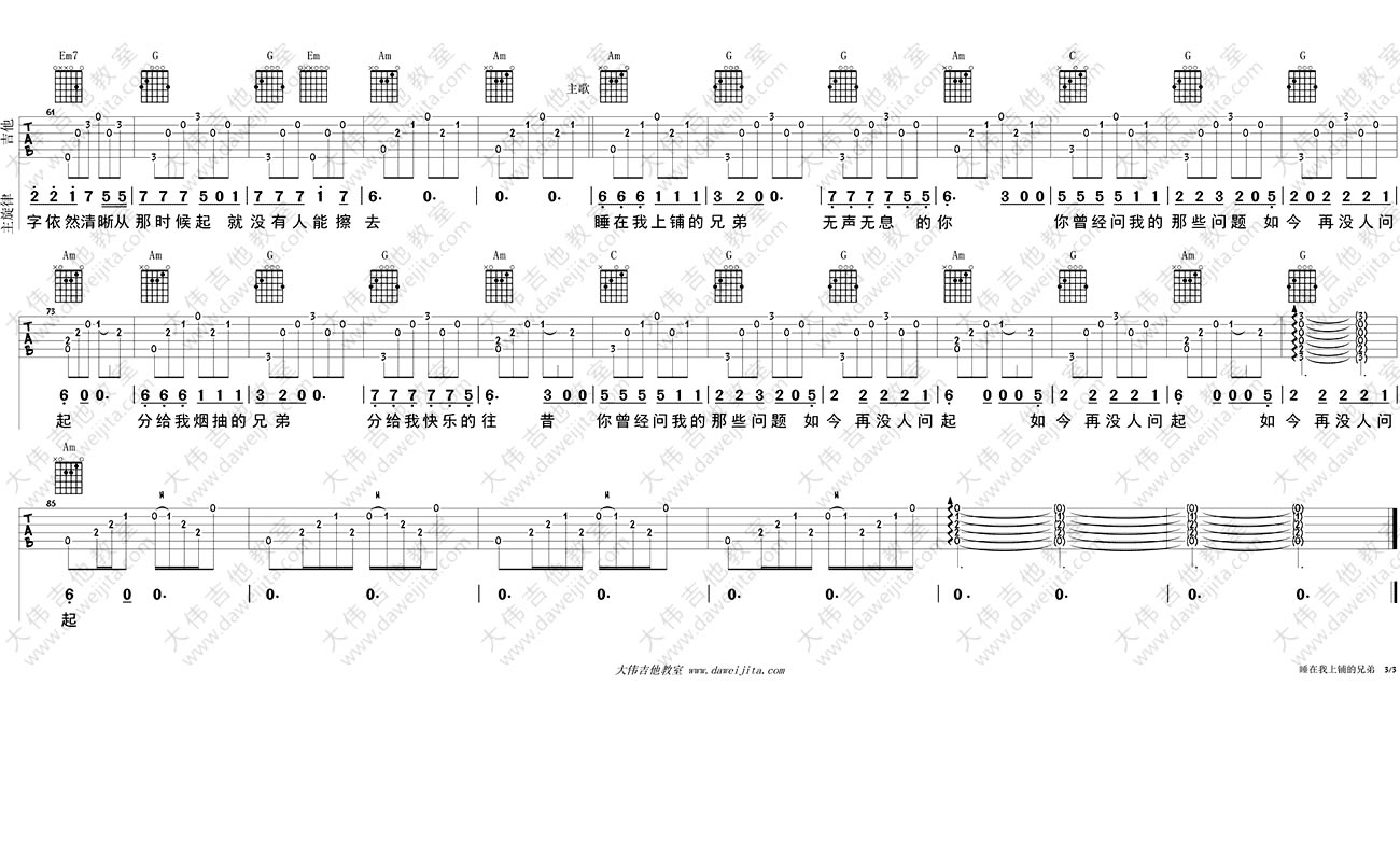 这首曲谱是原调F的吉他曲,通过将capo夹在五品,选用C调指法演奏。感谢大伟吉他编配以及文奇老师提供的《睡在我上铺的兄弟》吉他弹唱教学视频。这首歌是高晓松的校园经典,用一把吉他和深情的民谣唱出了校园时光的怀念和感伤。这是一首充满代表性和让人怀念的校园时光的歌曲