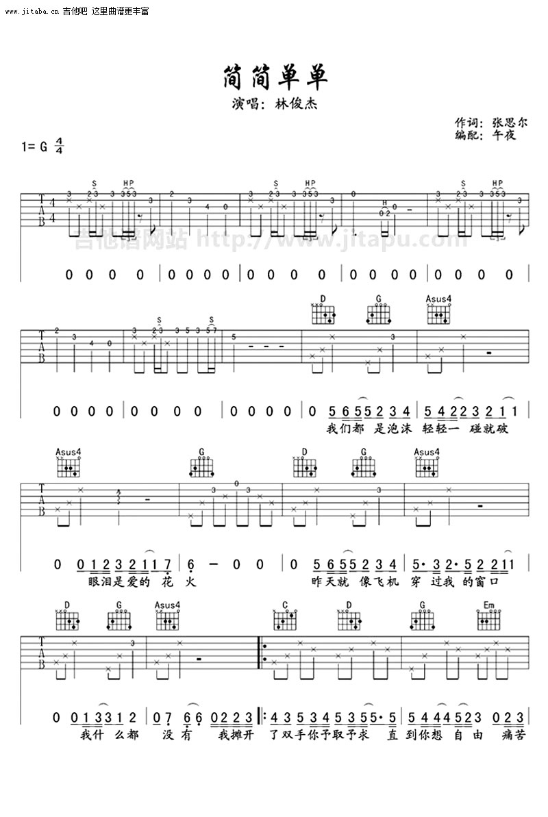 《林俊杰《简简单单吉他谱》(G调)》内容来自于互联网,不能保证内容的准确性与完整性,仅供学习交流欣赏,请勿用于其它用途,内容版权归原作者及来源网站所有,如有侵犯到您的权益请来信告知,我们将及时删除。
