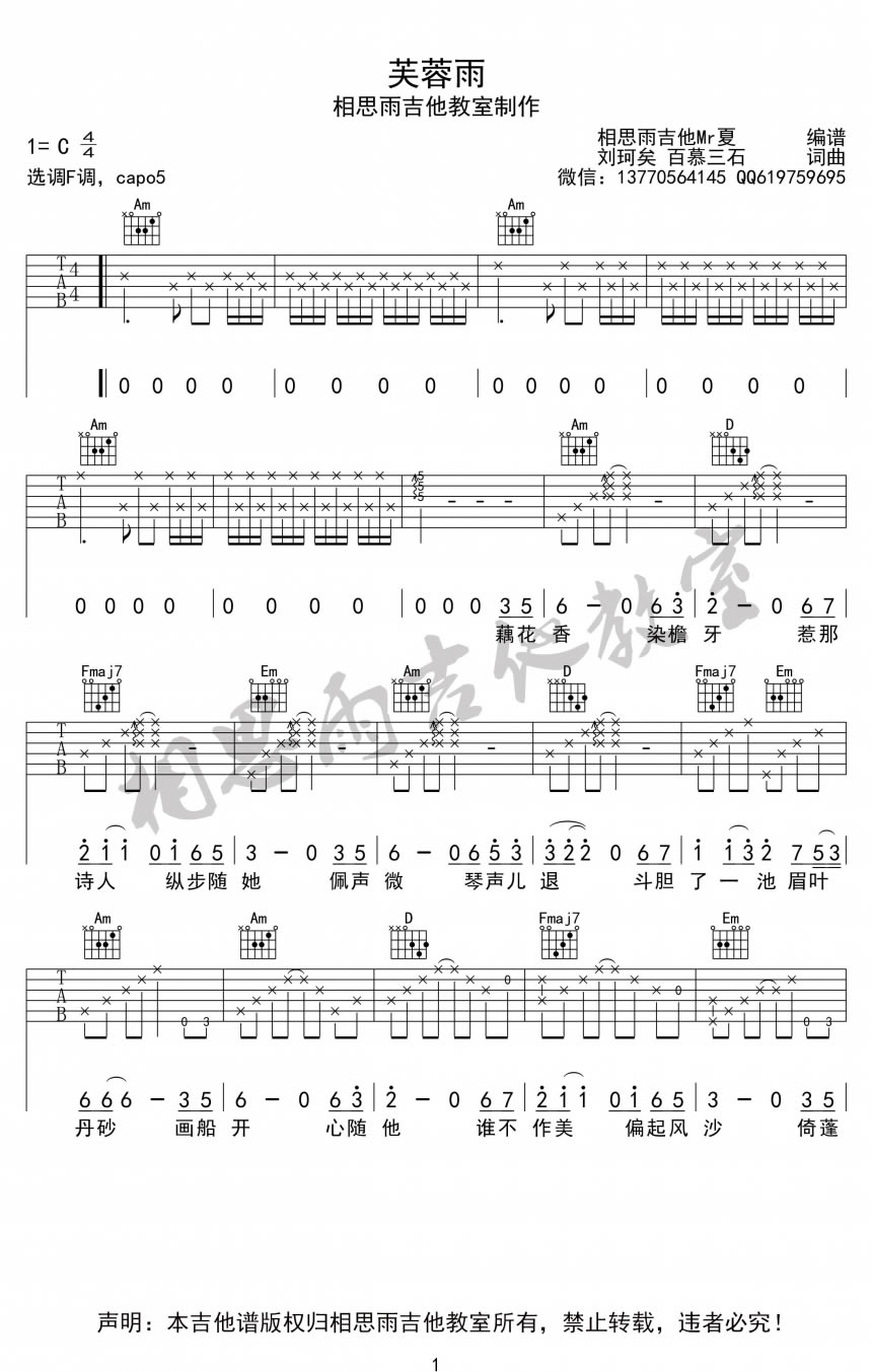 刘珂矣演唱的《芙蓉雨》吉他曲谱由相思雨吉他教室制作,Mr夏编写,采用Capo夹五品,包含芙蓉雨的吉他弹唱六线谱。这首歌曲在天籁之音中穿越古今,让人仿佛置身于忘尘谷的半壶纱中,感受到芙蓉雨外一袖云的意境。曲谱图文混排,共有四张图片,为吉他爱好者提供了完整的指引。