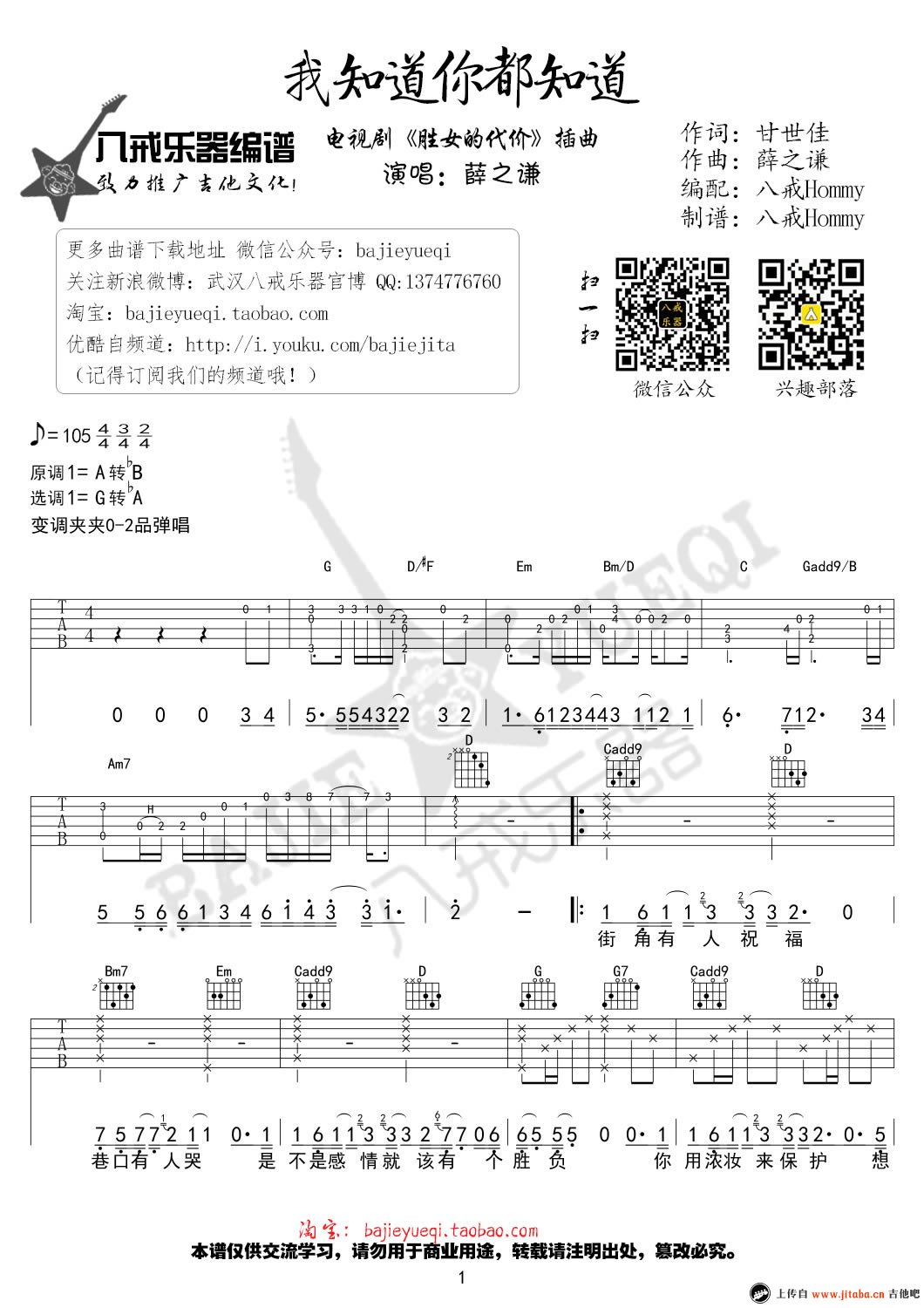 薛之谦的歌曲《我知道你都知道》以吉他谱的形式呈现,是电视剧《胜女的代价》的插曲。这首歌的吉他谱以A调为原调,经过G调转换并用CAPO夹在二品,展示了完整的六线谱,包含三张图片谱。歌词中的“我知道你全都知道,保持沉默,你不想太计较”透露出深切的惋惜和痛苦情感,歌