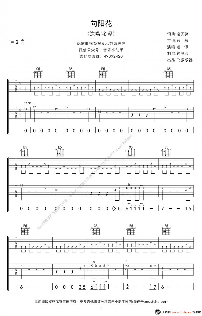 谢天笑演唱的《向阳花》吉他谱以G调指法编排,展示在六线谱上,提供了高清的图片谱,总共包含六张谱例,分布在两页中。这首歌曲传达着坚持与生长的主题,无论生活有多艰难,一颗种子都要决心生长发芽。谢天笑致敬摇滚音乐,传递着坚定的信念。通过这支歌曲,他呼吁我们像向阳花一