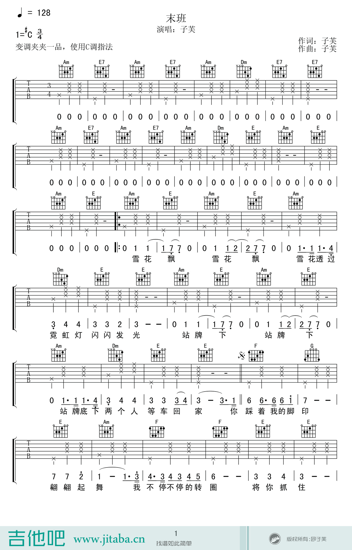 《民谣唱作人子芙《末班吉他谱》(C调)》内容来自于互联网,不能保证内容的准确性与完整性,仅供学习交流欣赏,请勿用于其它用途,内容版权归原作者及来源网站所有,如有侵犯到您的权益请来信告知,我们将及时删除。