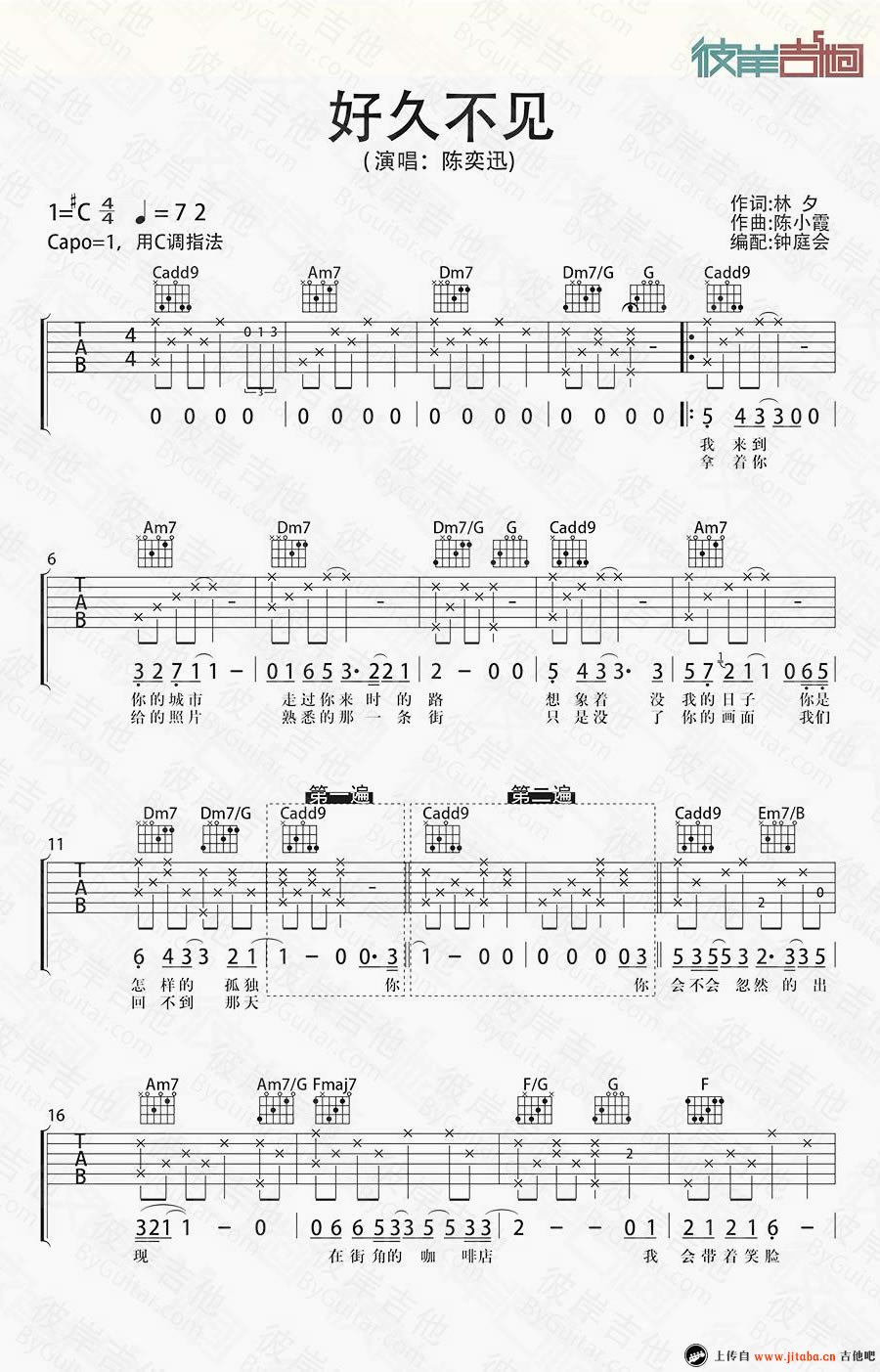 《陈奕迅《好久不见吉他谱》(C调)》内容来自于互联网,不能保证内容的准确性与完整性,仅供学习交流欣赏,请勿用于其它用途,内容版权归原作者及来源网站所有,如有侵犯到您的权益请来信告知,我们将及时删除。