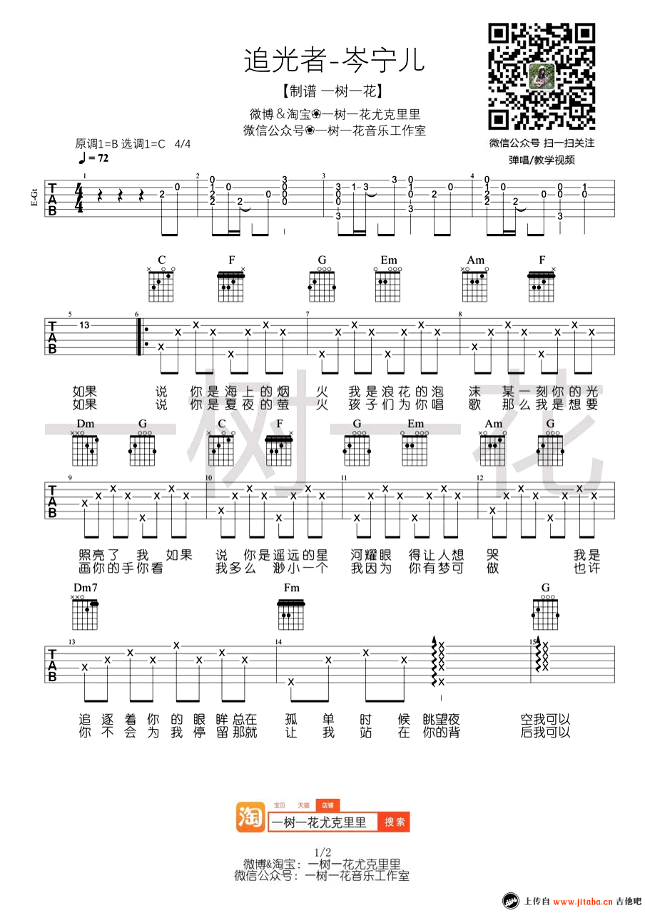 《岑宁儿《追光者吉他谱》(C调)》内容来自于互联网,不能保证内容的准确性与完整性,仅供学习交流欣赏,请勿用于其它用途,内容版权归原作者及来源网站所有,如有侵犯到您的权益请来信告知,我们将及时删除。