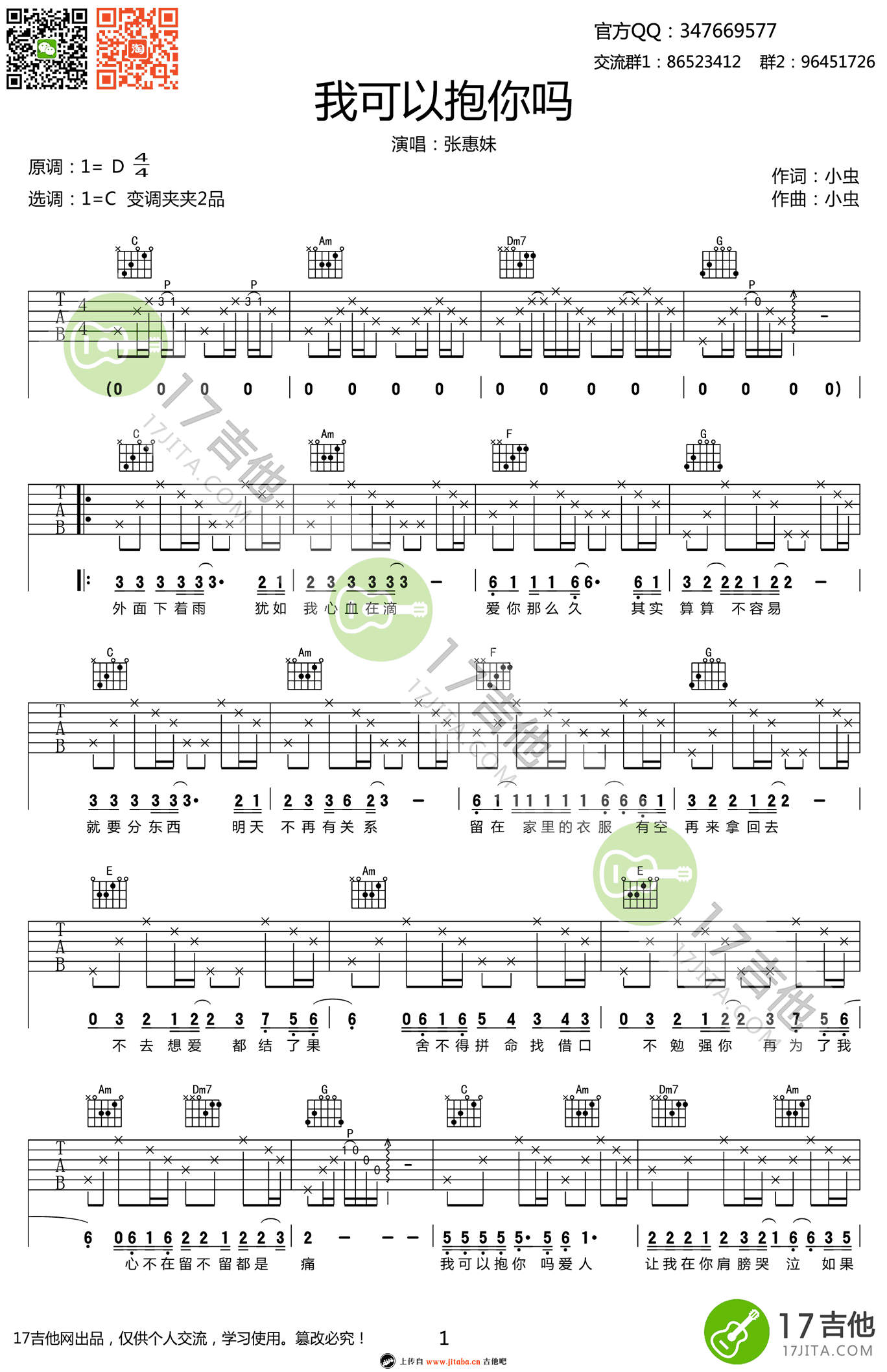 《张惠妹《我可以抱你吗吉他谱》(C调)》内容来自于互联网,不能保证内容的准确性与完整性,仅供学习交流欣赏,请勿用于其它用途,内容版权归原作者及来源网站所有,如有侵犯到您的权益请来信告知,我们将及时删除。
