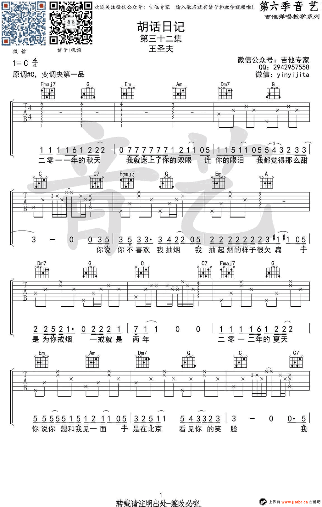 《王圣夫《胡话日记吉他谱》(C调)》内容来自于互联网,不能保证内容的准确性与完整性,仅供学习交流欣赏,请勿用于其它用途,内容版权归原作者及来源网站所有,如有侵犯到您的权益请来信告知,我们将及时删除。