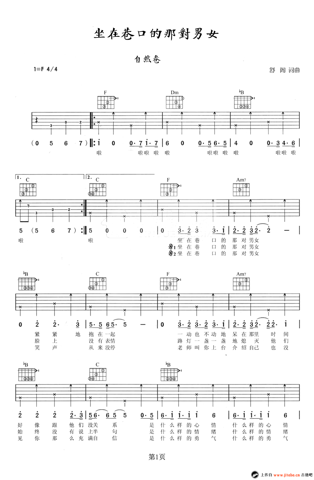 《自然卷《坐在巷口的那对男女--吉他谱》》内容来自于互联网,不能保证内容的准确性与完整性,仅供学习交流欣赏,请勿用于其它用途,内容版权归原作者及来源网站所有,如有侵犯到您的权益请来信告知,我们将及时删除。