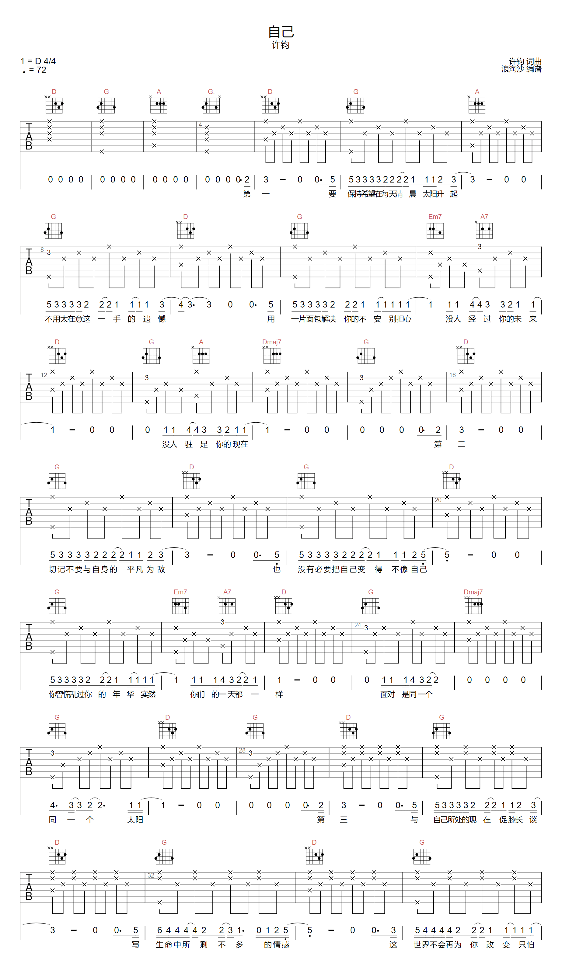 《许钧《自己吉他谱》(C调)》内容来自于互联网,不能保证内容的准确性与完整性,仅供学习交流欣赏,请勿用于其它用途,内容版权归原作者及来源网站所有,如有侵犯到您的权益请来信告知,我们将及时删除。