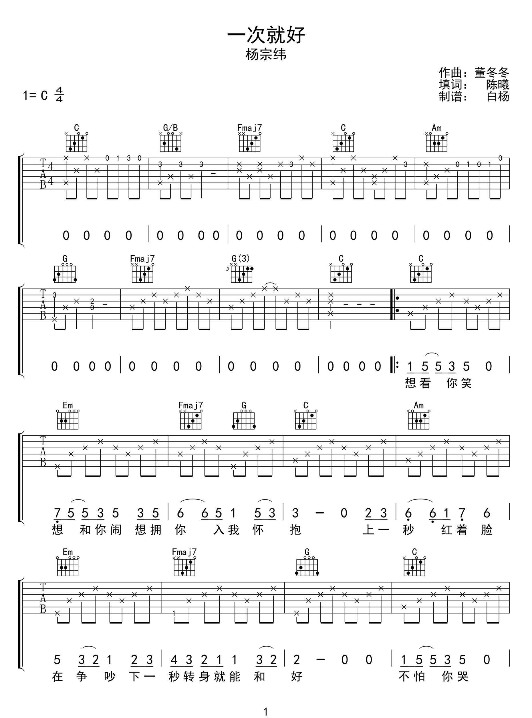 杨宗纬《一次就好吉他谱》(C调)