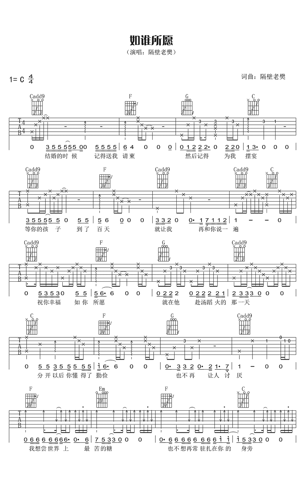 《隔壁老樊《如谁所愿吉他谱》(C调)》内容来自于互联网,不能保证内容的准确性与完整性,仅供学习交流欣赏,请勿用于其它用途,内容版权归原作者及来源网站所有,如有侵犯到您的权益请来信告知,我们将及时删除。