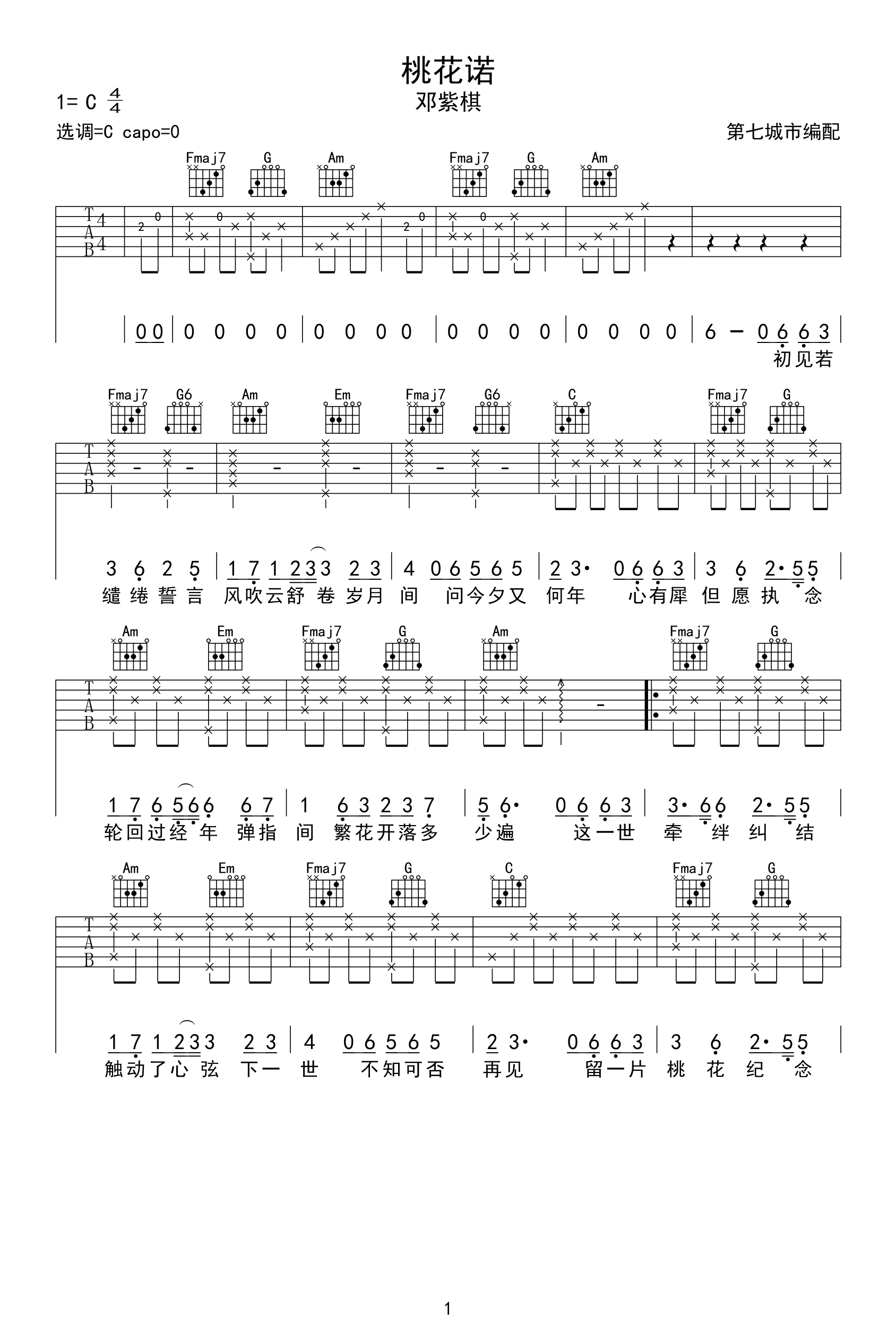 《邓紫棋《桃花诺吉他谱》(G调)》内容来自于互联网,不能保证内容的准确性与完整性,仅供学习交流欣赏,请勿用于其它用途,内容版权归原作者及来源网站所有,如有侵犯到您的权益请来信告知,我们将及时删除。