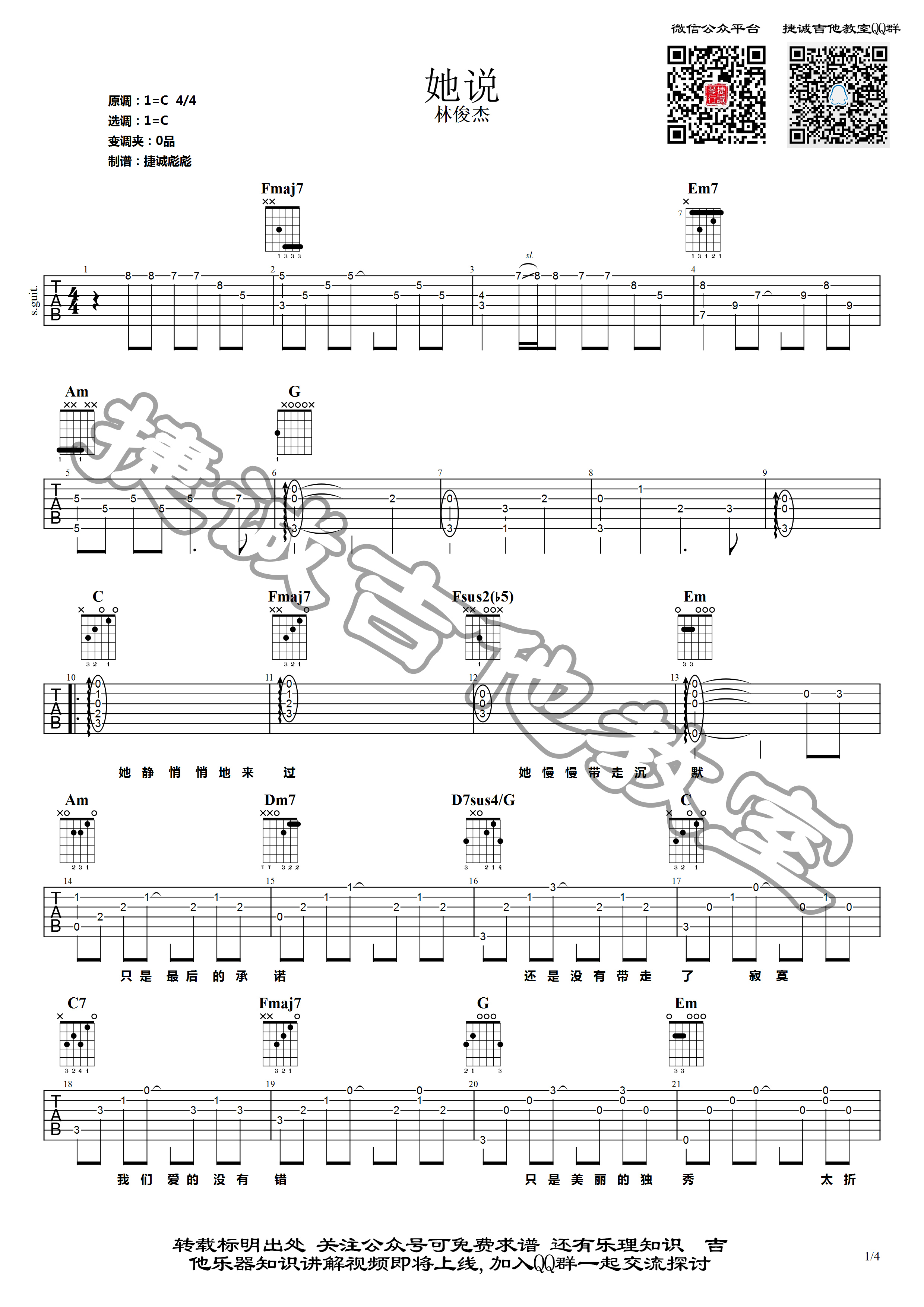 《林俊杰《她说吉他谱》(E调)》内容来自于互联网,不能保证内容的准确性与完整性,仅供学习交流欣赏,请勿用于其它用途,内容版权归原作者及来源网站所有,如有侵犯到您的权益请来信告知,我们将及时删除。