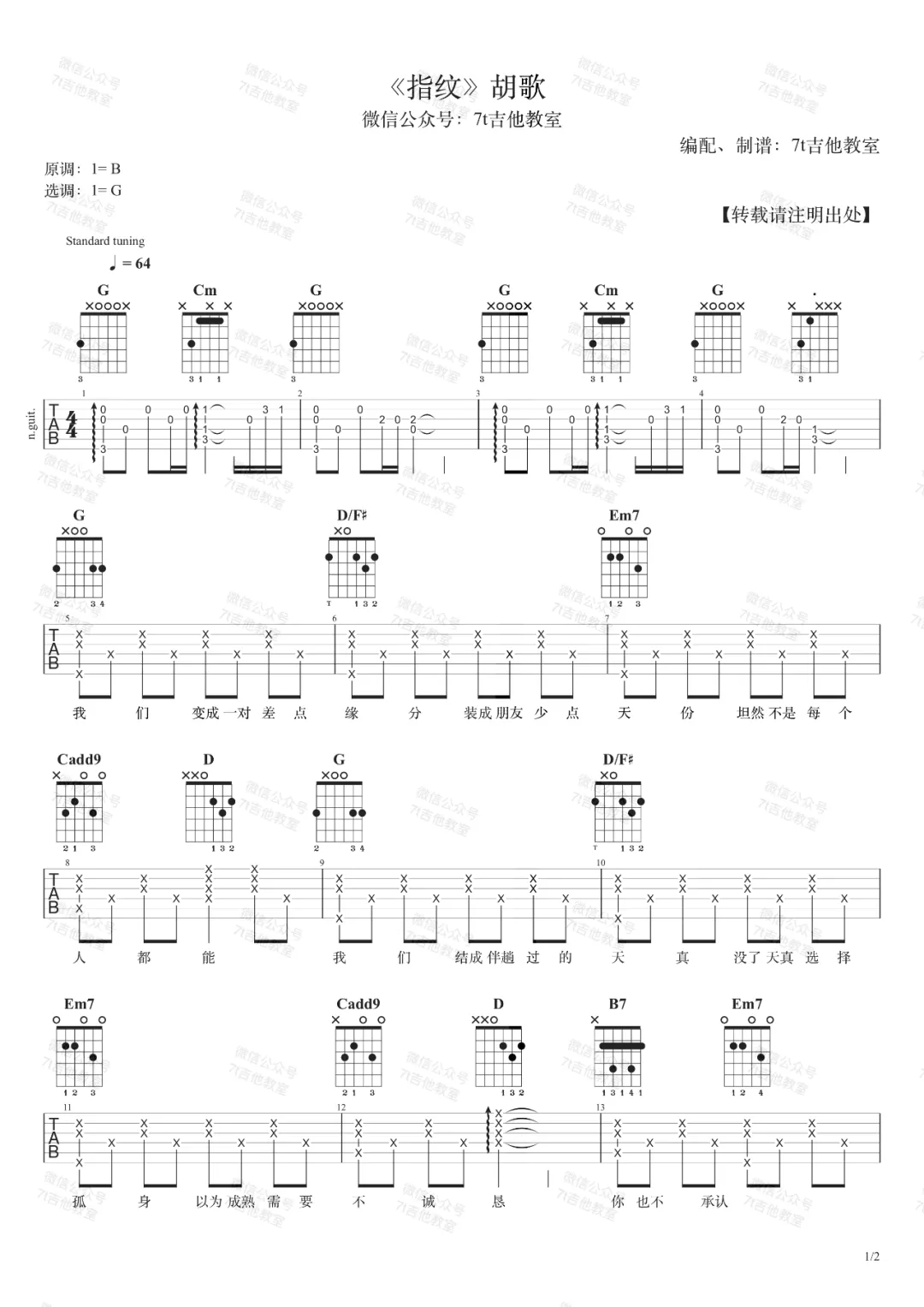 《胡歌《指纹吉他谱》(C调)》内容来自于互联网,不能保证内容的准确性与完整性,仅供学习交流欣赏,请勿用于其它用途,内容版权归原作者及来源网站所有,如有侵犯到您的权益请来信告知,我们将及时删除。