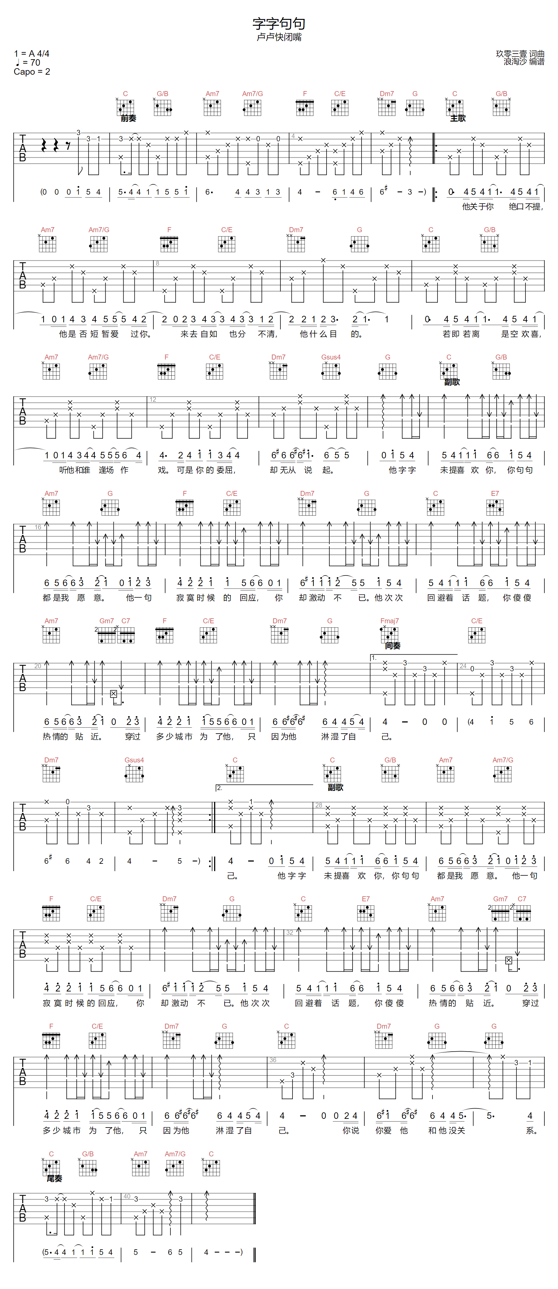 《卢卢快闭嘴《字字句句吉他谱》(G调)》内容来自于互联网,不能保证内容的准确性与完整性,仅供学习交流欣赏,请勿用于其它用途,内容版权归原作者及来源网站所有,如有侵犯到您的权益请来信告知,我们将及时删除。