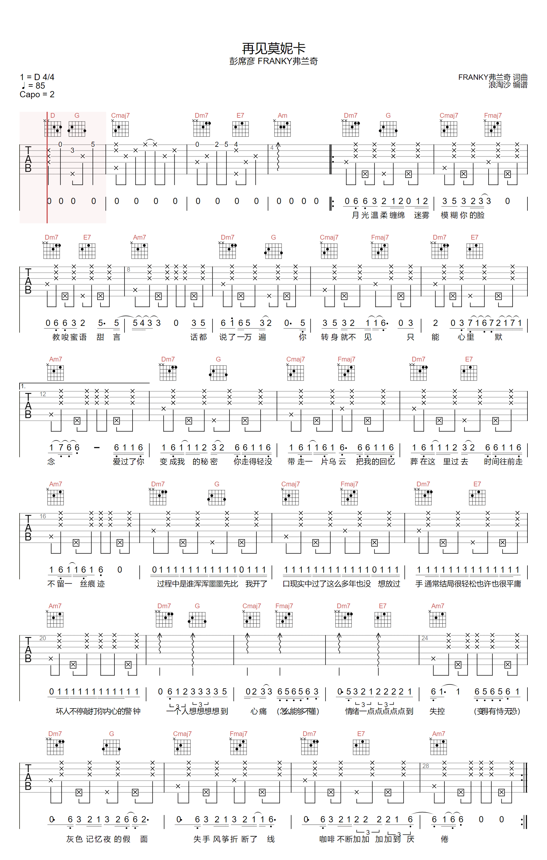 彭席彦《再见莫妮卡吉他谱》(D调)