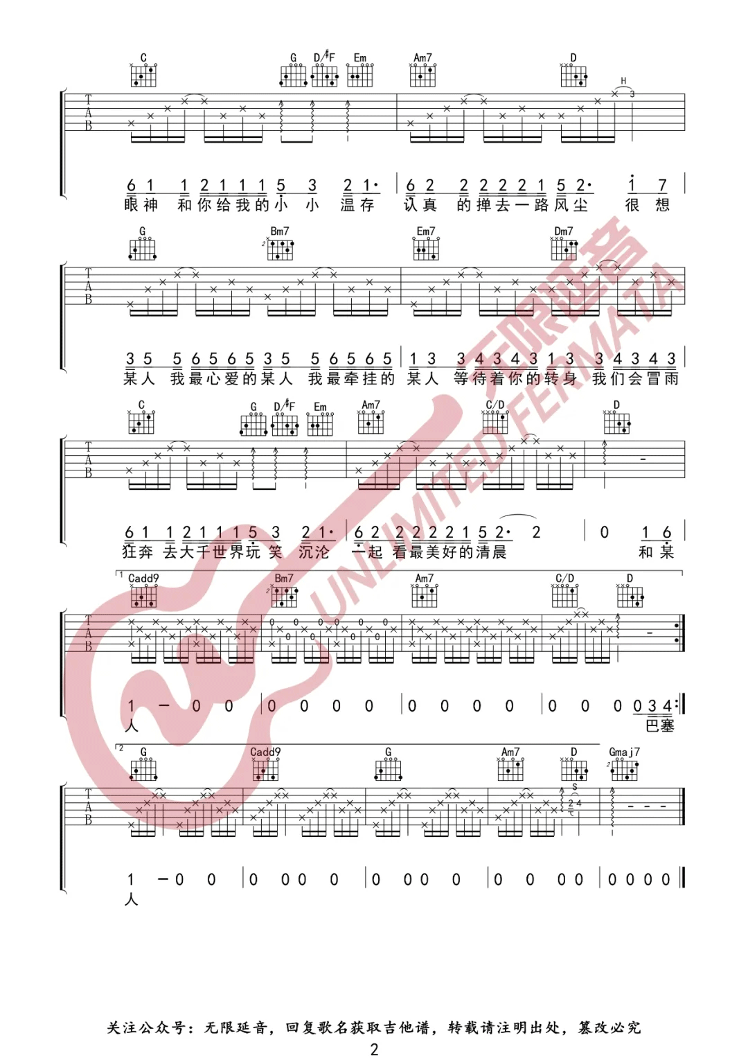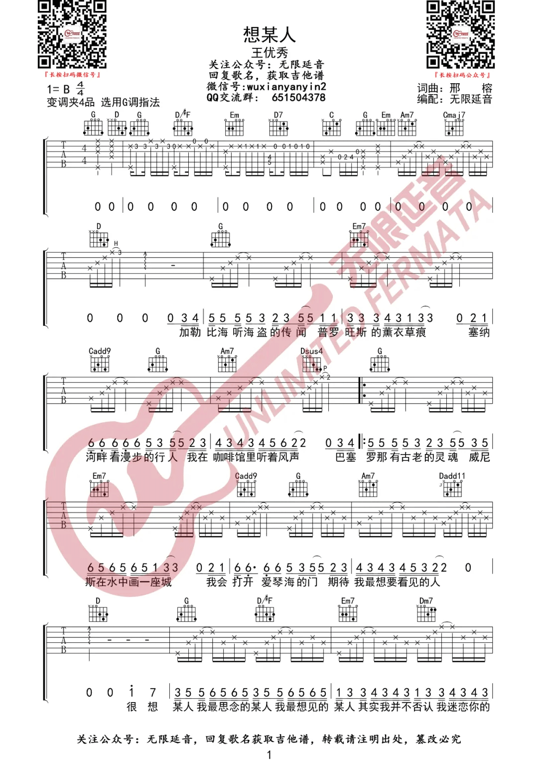 想某人王优秀演唱C调,的版本,用变调夹夹第二品为由王优的,制谱,谱,节奏为4/4拍,速度为90拍每分钟,弹唱建议变调夹夹5品,难度简单。