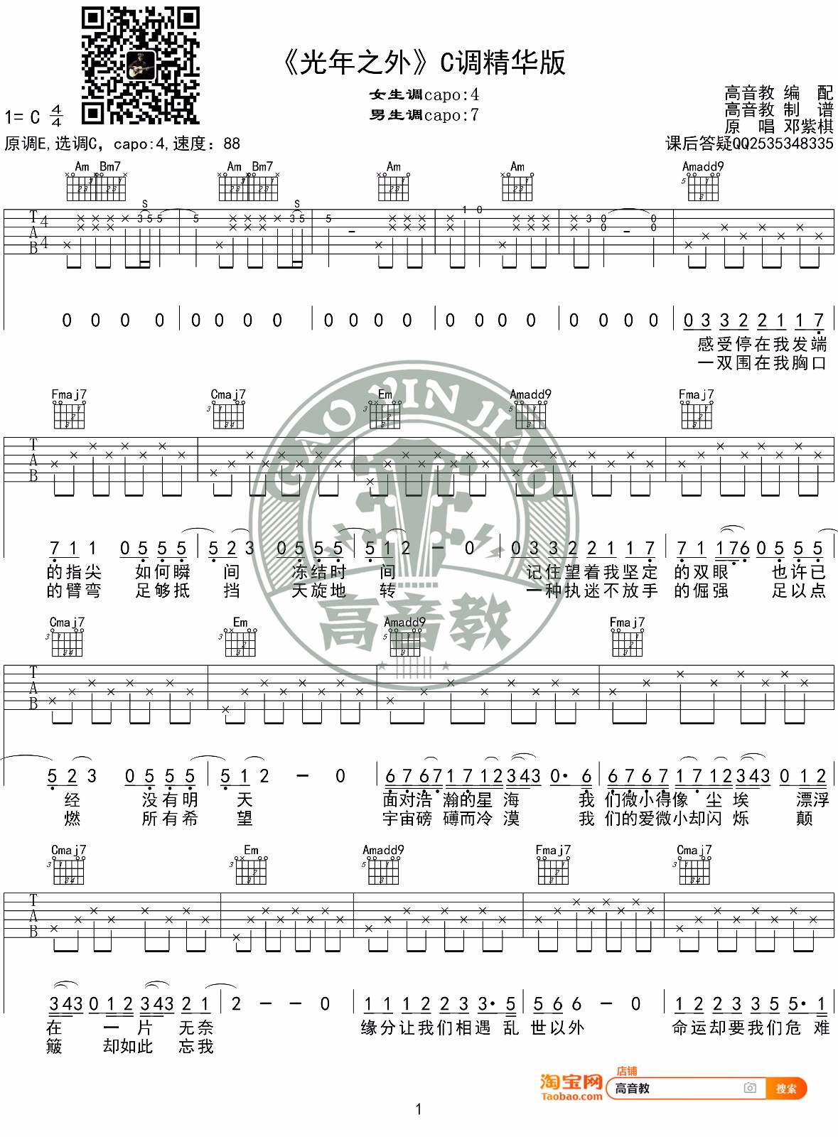 《邓紫棋《光年之外吉他谱》(C调)》内容来自于互联网,不能保证内容的准确性与完整性,仅供学习交流欣赏,请勿用于其它用途,内容版权归原作者及来源网站所有,如有侵犯到您的权益请来信告知,我们将及时删除。