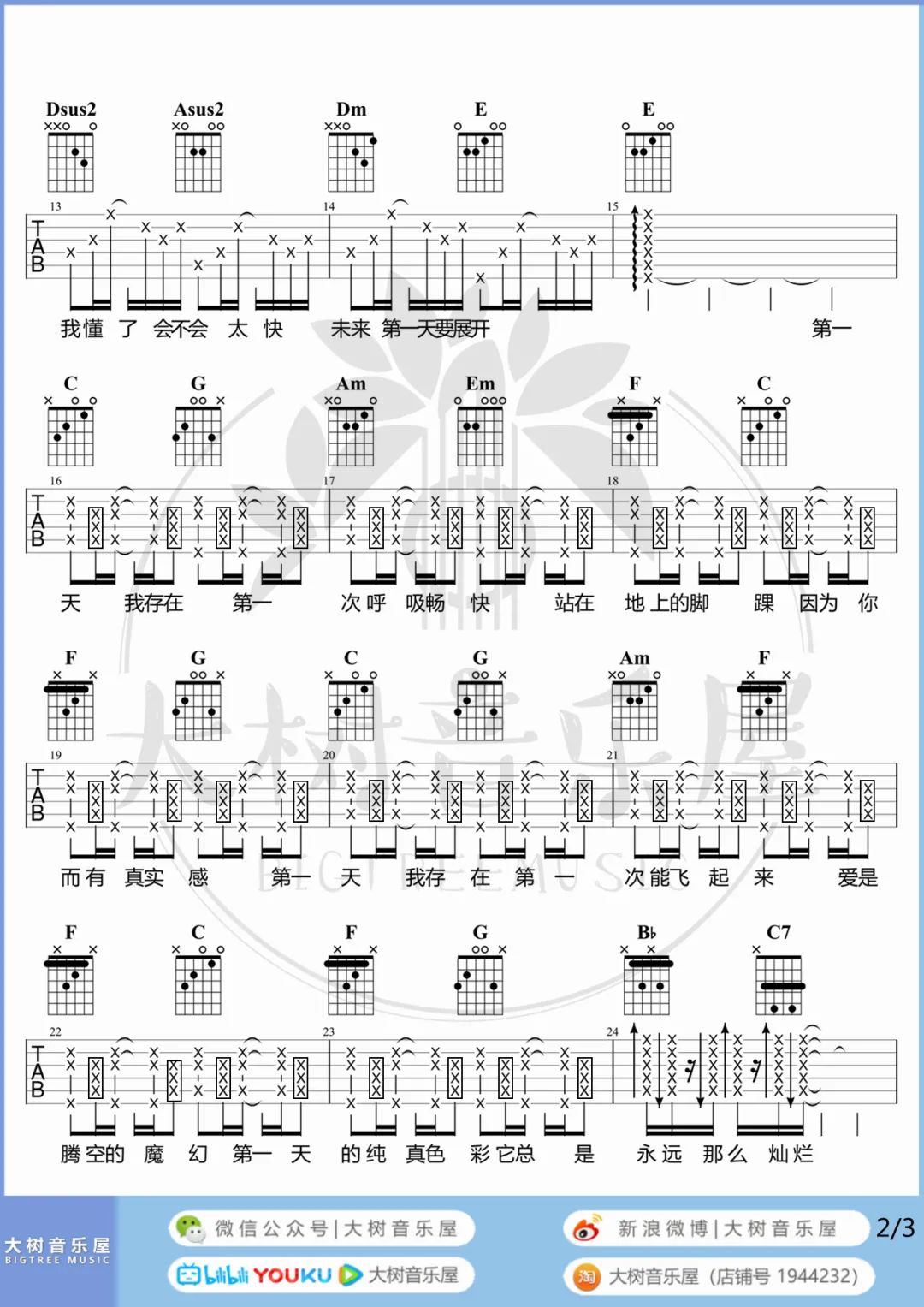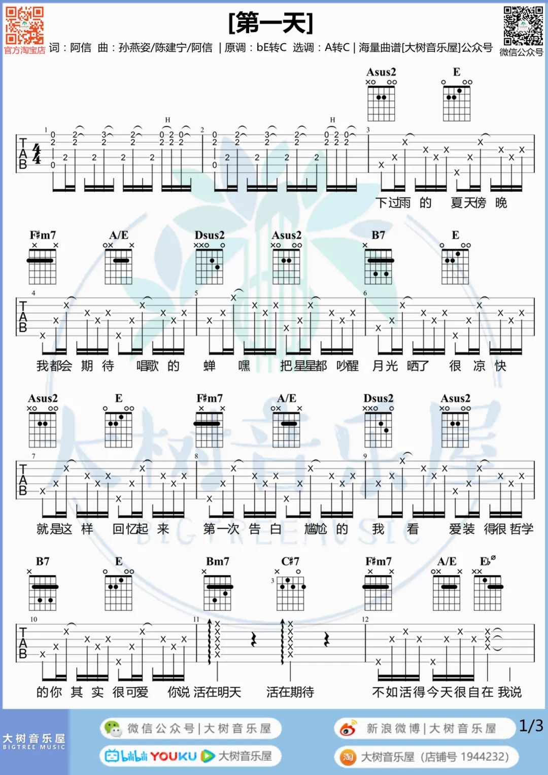 《孙燕姿《第一天吉他谱》(C调)》内容来自于互联网,不能保证内容的准确性与完整性,仅供学习交流欣赏,请勿用于其它用途,内容版权归原作者及来源网站所有,如有侵犯到您的权益请来信告知,我们将及时删除。