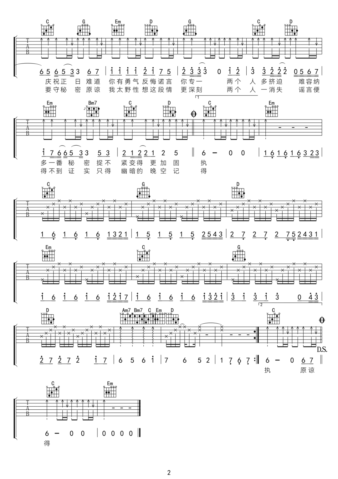 王菲《你在终点等我吉他谱》(C调)