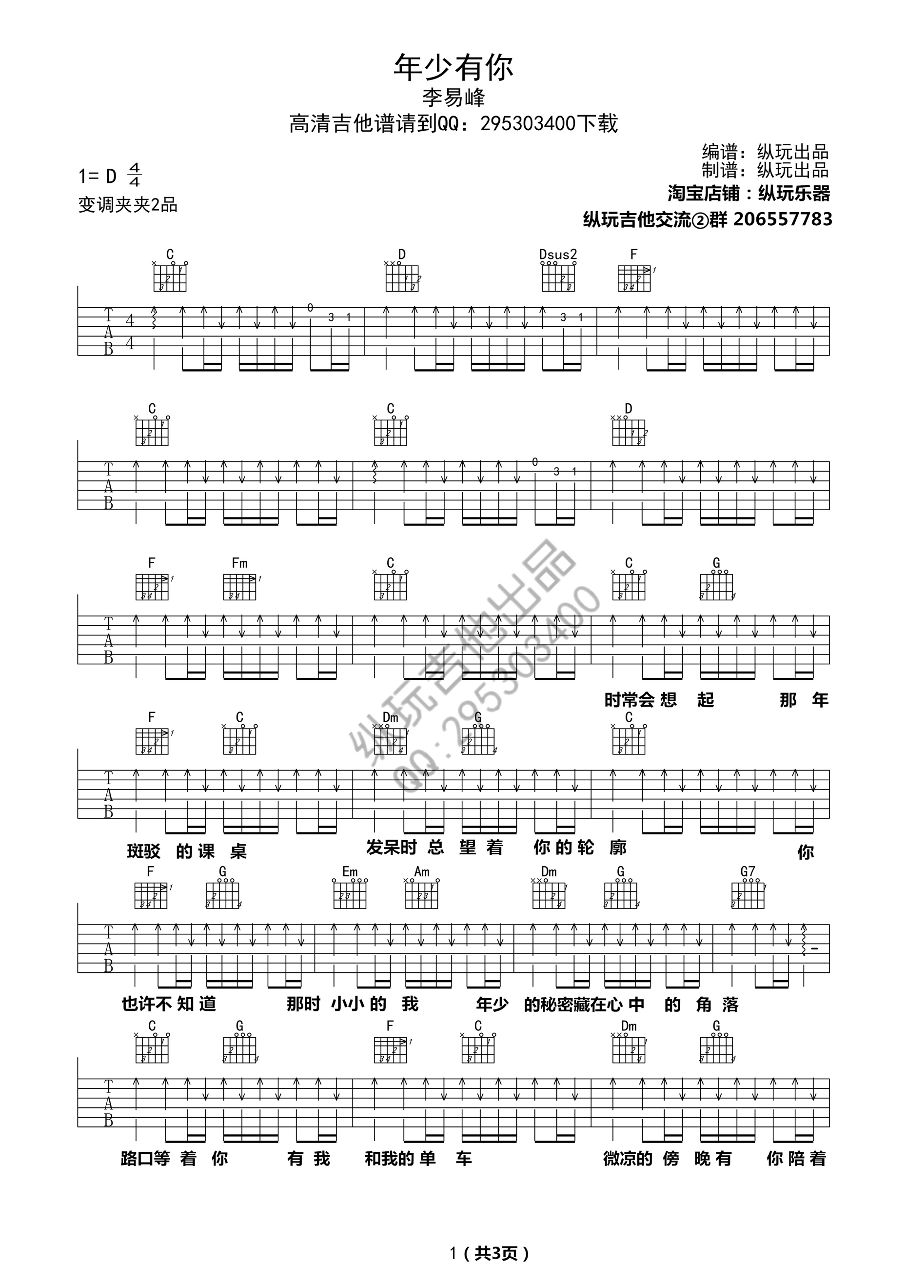 《李易峰《年少有你吉他谱》(C调)》内容来自于互联网,不能保证内容的准确性与完整性,仅供学习交流欣赏,请勿用于其它用途,内容版权归原作者及来源网站所有,如有侵犯到您的权益请来信告知,我们将及时删除。