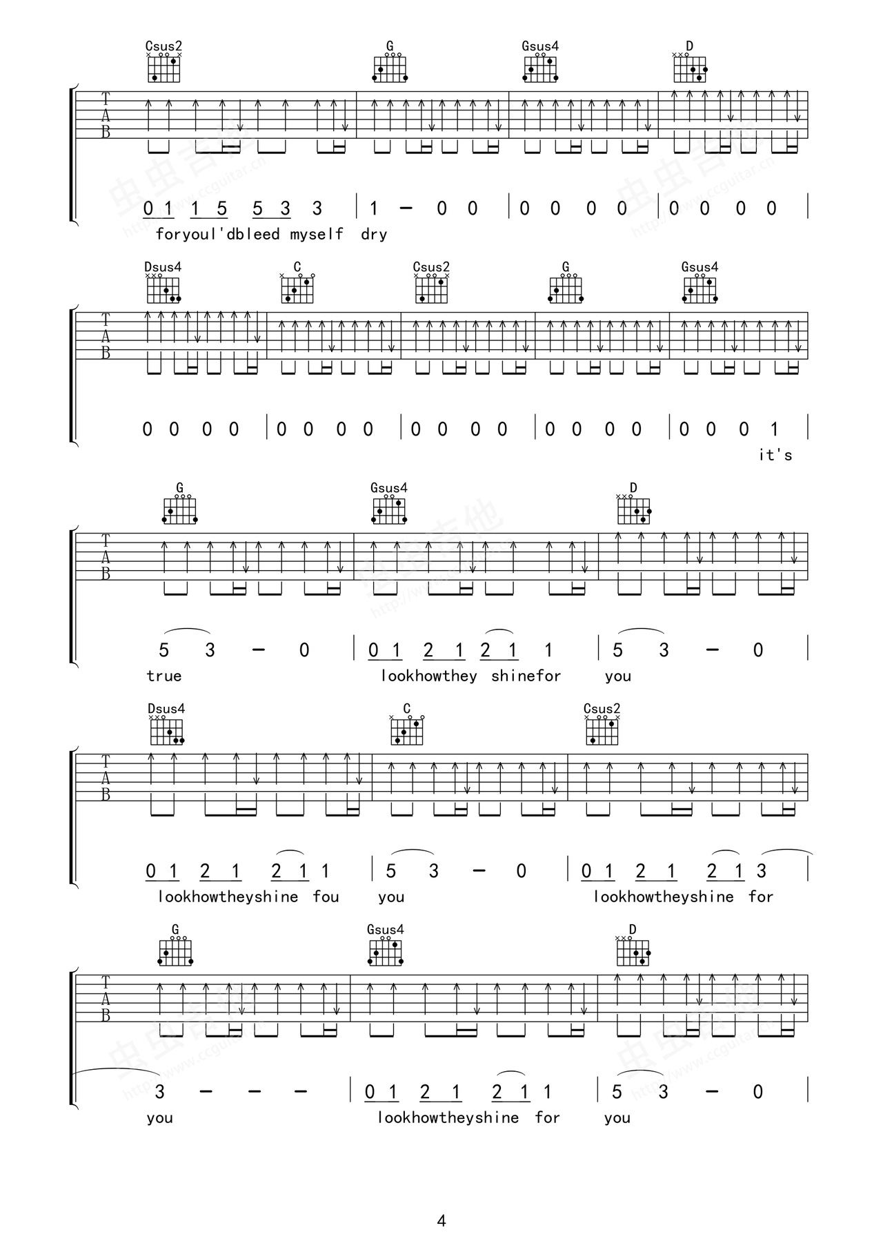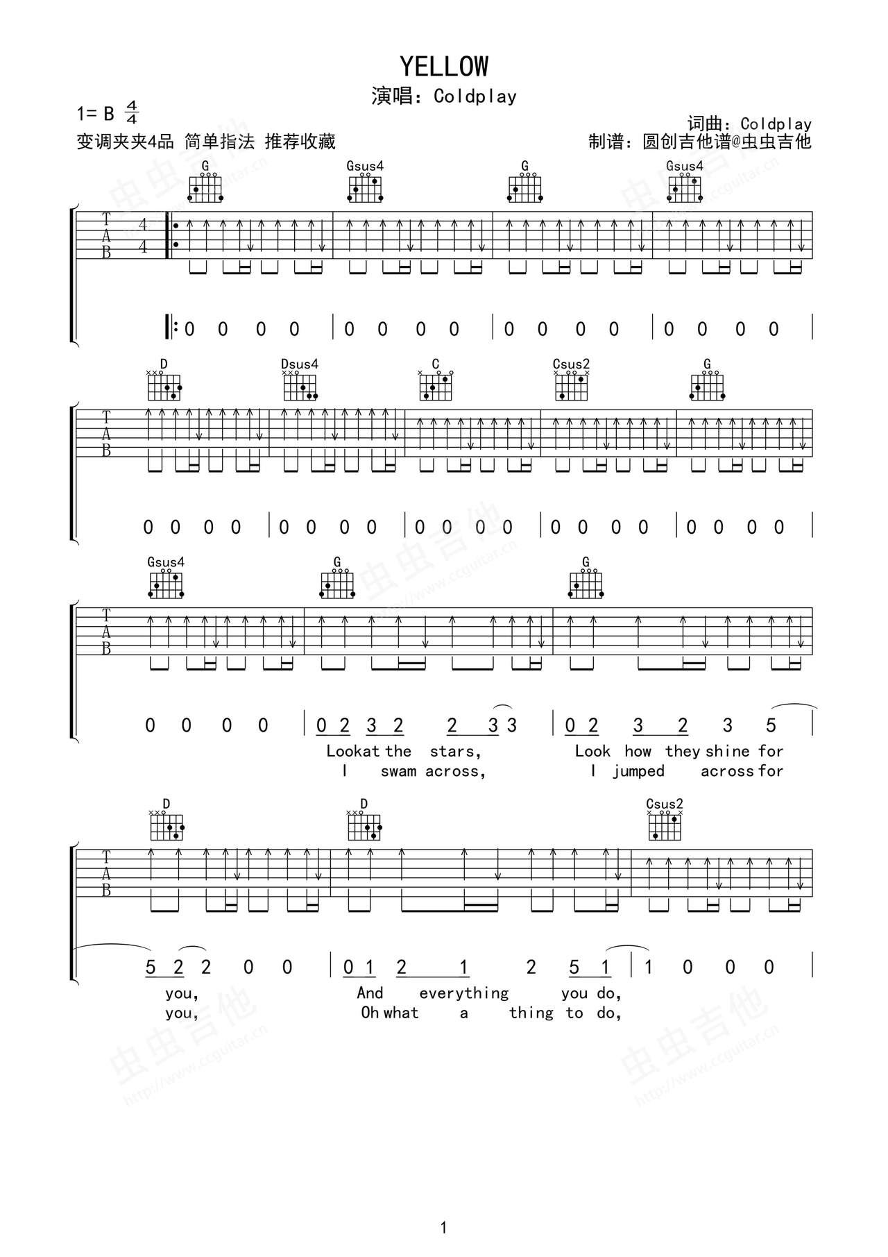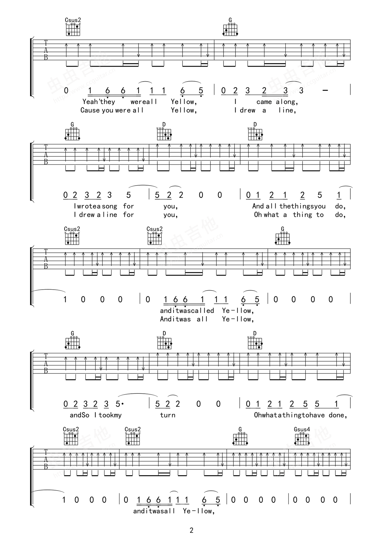 《Coldplay《Yellow吉他谱》(G调)》内容来自于互联网,不能保证内容的准确性与完整性,仅供学习交流欣赏,请勿用于其它用途,内容版权归原作者及来源网站所有,如有侵犯到您的权益请来信告知,我们将及时删除。
