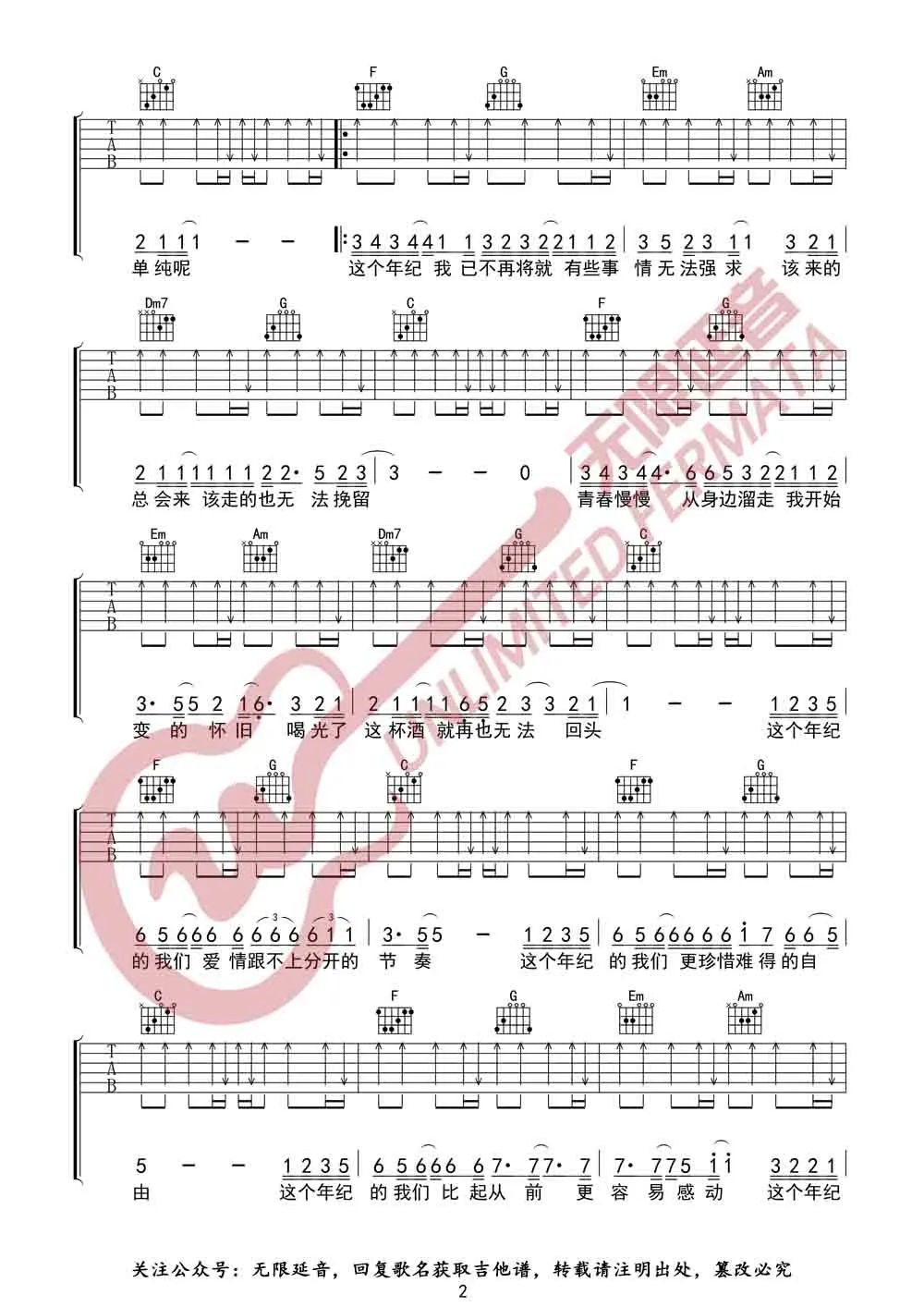 《齐一 《这个年纪吉他谱》(D调)》内容来自于互联网,不能保证内容的准确性与完整性,仅供学习交流欣赏,请勿用于其它用途,内容版权归原作者及来源网站所有,如有侵犯到您的权益请来信告知,我们将及时删除。