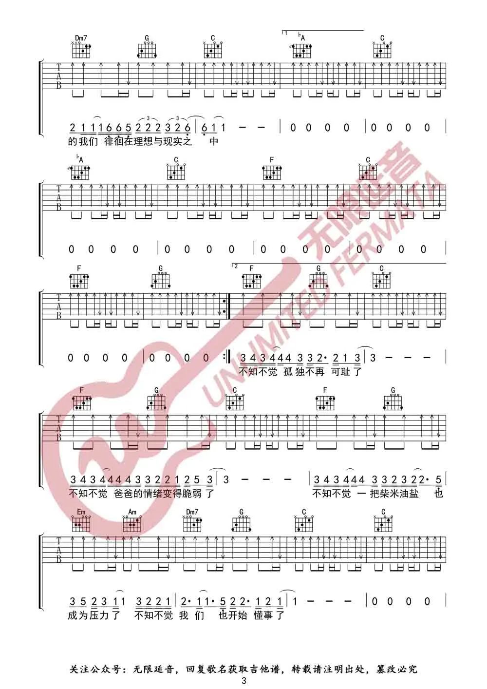 《这个年纪》由齐一演唱,采用D调编配,实际演奏为G大调。歌曲以标准音调弦,变调夹夹二品,适合中低音域男声。女声可降半音适应。作品表达了对青春岁月的怀念与成长感悟,旋律温暖真挚。演奏时需注重情感递进,运用柔和的分解和弦与平稳的节奏推进。编曲简洁却富有感染力,通过