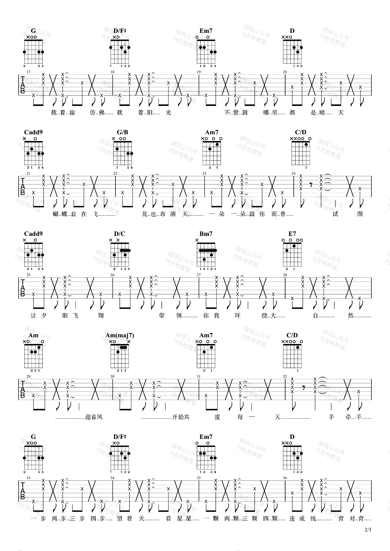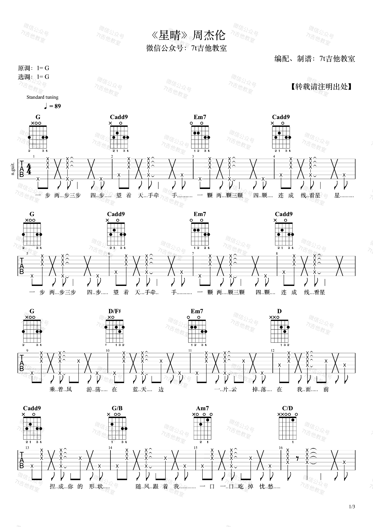《周杰伦《星晴吉他谱》(G调)》内容来自于互联网,不能保证内容的准确性与完整性,仅供学习交流欣赏,请勿用于其它用途,内容版权归原作者及来源网站所有,如有侵犯到您的权益请来信告知,我们将及时删除。