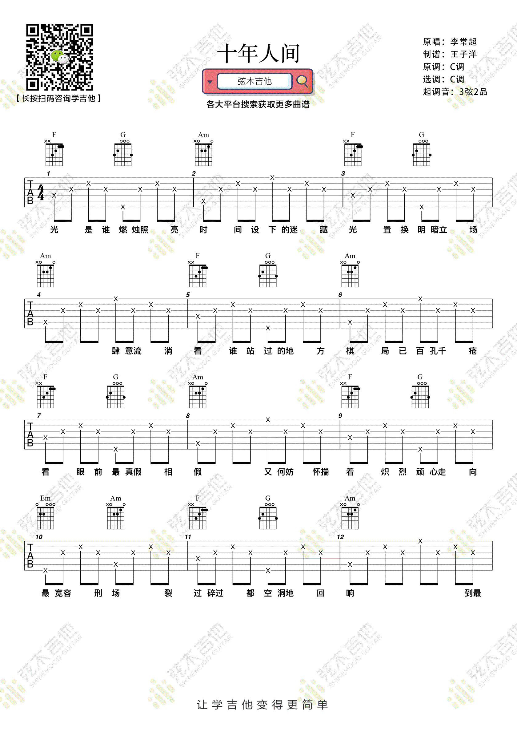《李常超《十年人间吉他谱》(G调)》内容来自于互联网,不能保证内容的准确性与完整性,仅供学习交流欣赏,请勿用于其它用途,内容版权归原作者及来源网站所有,如有侵犯到您的权益请来信告知,我们将及时删除。