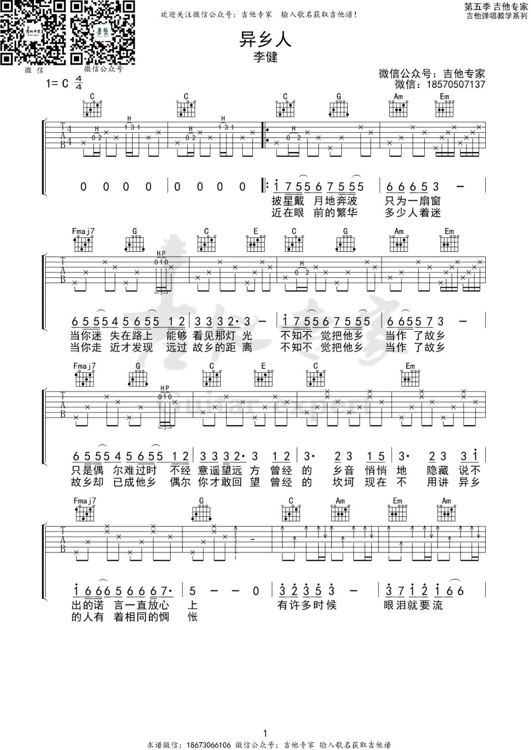 《李健《异乡人吉他谱》(G调)》内容来自于互联网,不能保证内容的准确性与完整性,仅供学习交流欣赏,请勿用于其它用途,内容版权归原作者及来源网站所有,如有侵犯到您的权益请来信告知,我们将及时删除。