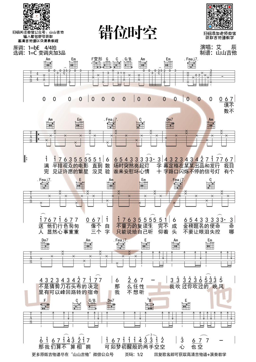《艾辰《错位时空吉他谱》(G调)》内容来自于互联网,不能保证内容的准确性与完整性,仅供学习交流欣赏,请勿用于其它用途,内容版权归原作者及来源网站所有,如有侵犯到您的权益请来信告知,我们将及时删除。