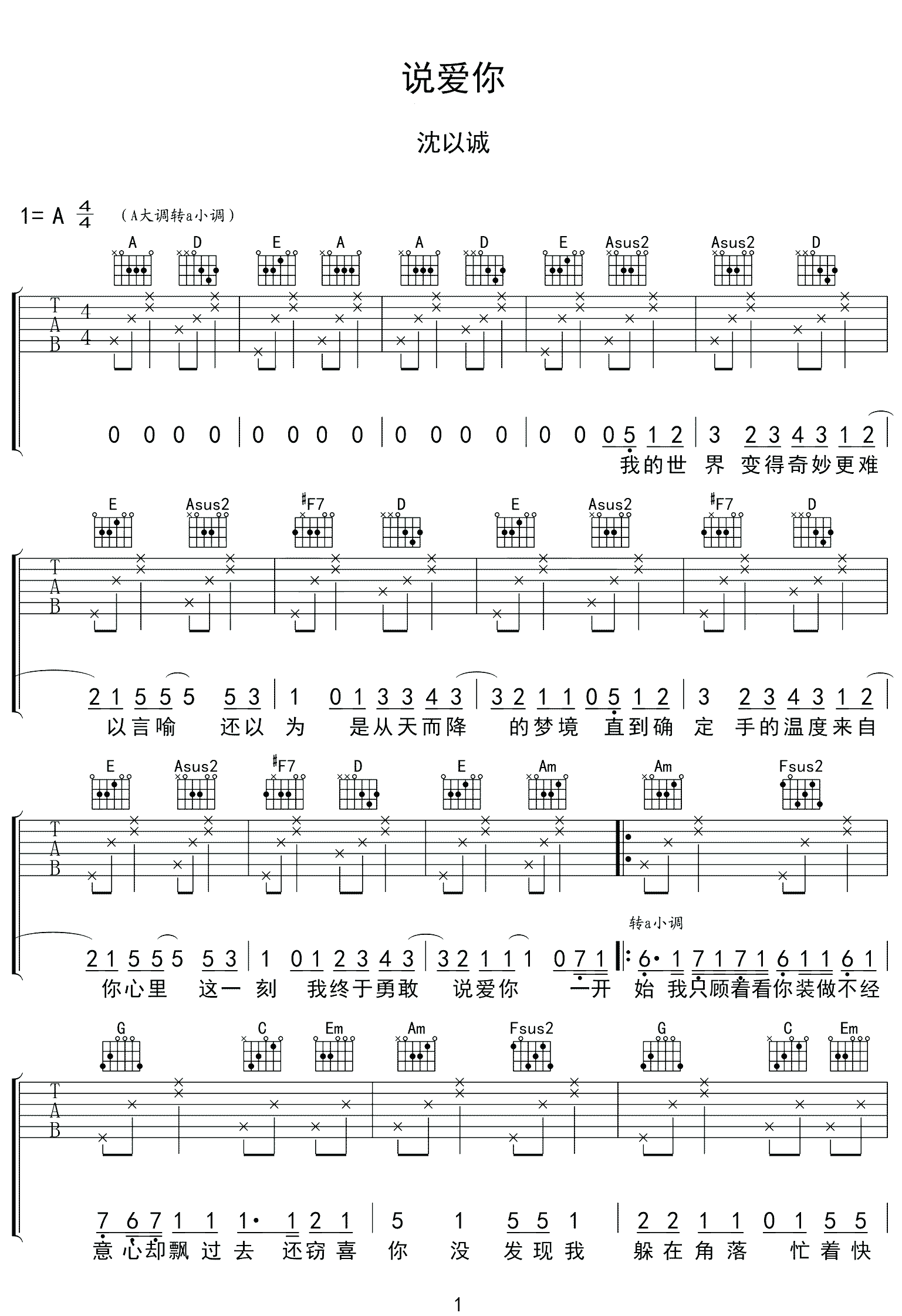 《沈以诚《说爱你吉他谱》(G调)》内容来自于互联网,不能保证内容的准确性与完整性,仅供学习交流欣赏,请勿用于其它用途,内容版权归原作者及来源网站所有,如有侵犯到您的权益请来信告知,我们将及时删除。