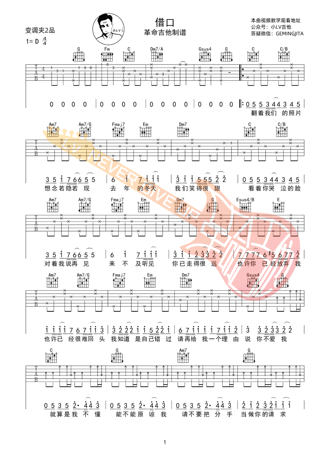 《周杰伦《借口吉他谱》(G调)》内容来自于互联网,不能保证内容的准确性与完整性,仅供学习交流欣赏,请勿用于其它用途,内容版权归原作者及来源网站所有,如有侵犯到您的权益请来信告知,我们将及时删除。