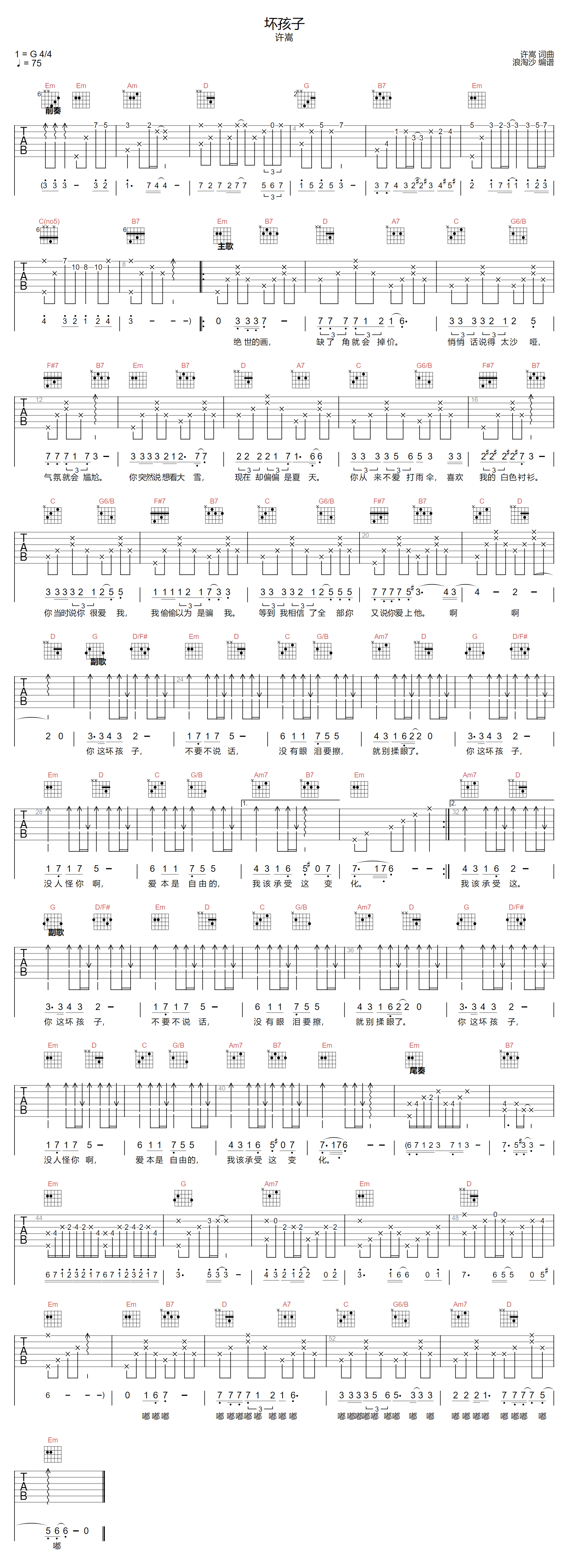 《许嵩《坏孩子吉他谱》(G调)》内容来自于互联网,不能保证内容的准确性与完整性,仅供学习交流欣赏,请勿用于其它用途,内容版权归原作者及来源网站所有,如有侵犯到您的权益请来信告知,我们将及时删除。