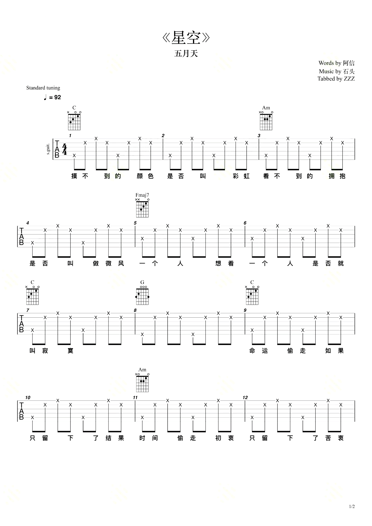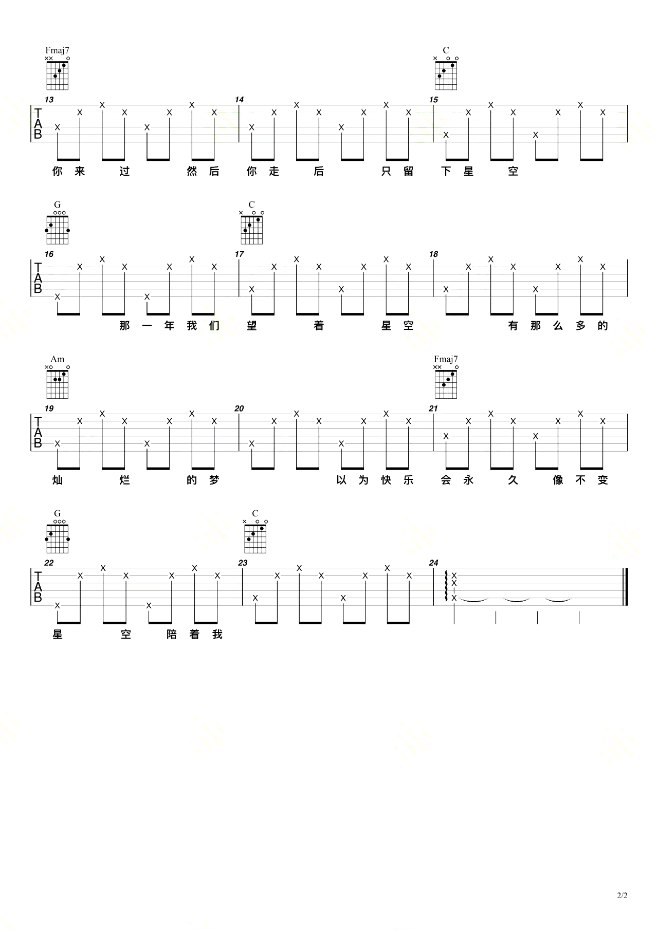 《五月天《星空吉他谱》(G调)》内容来自于互联网,不能保证内容的准确性与完整性,仅供学习交流欣赏,请勿用于其它用途,内容版权归原作者及来源网站所有,如有侵犯到您的权益请来信告知,我们将及时删除。