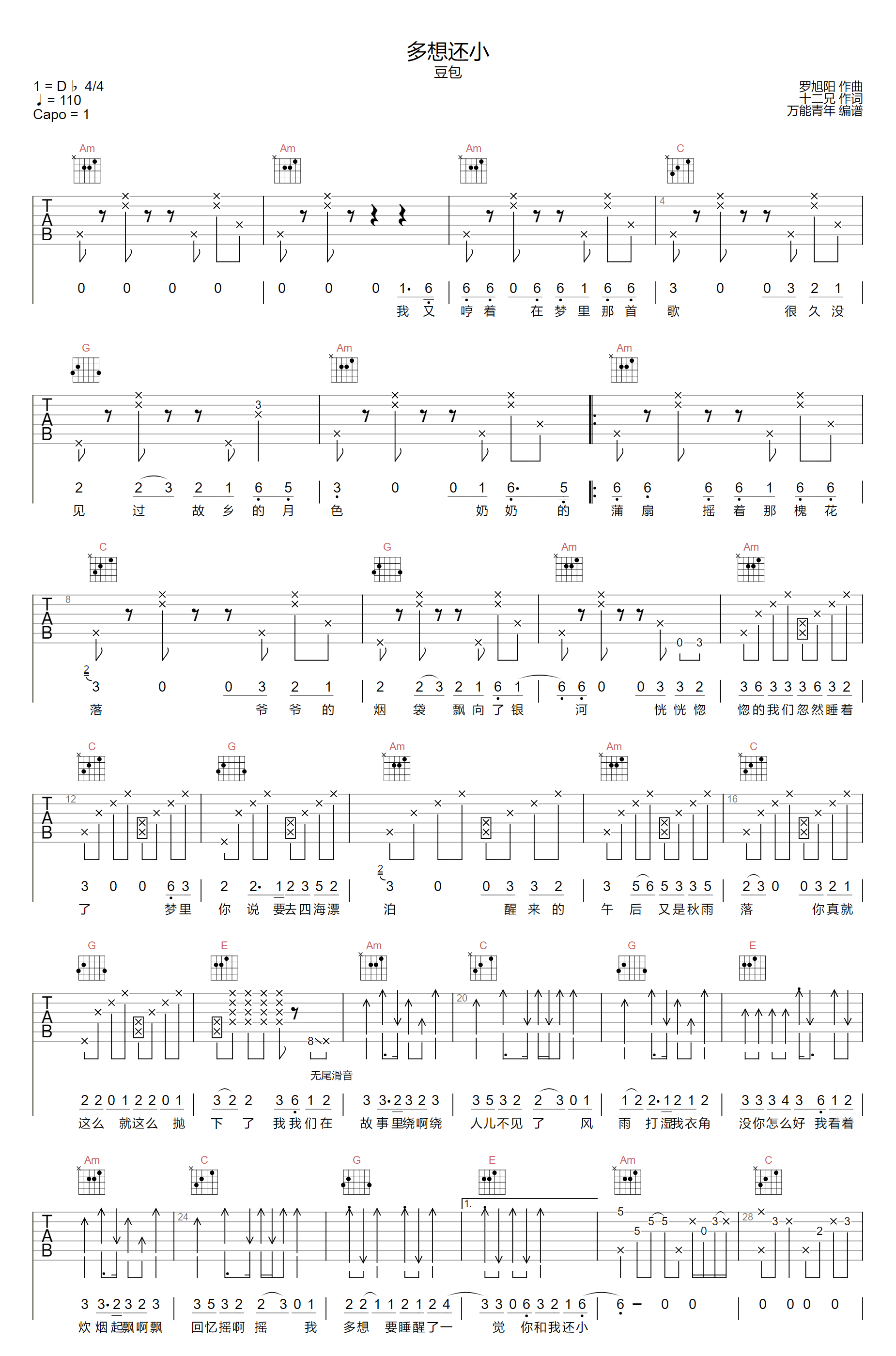 《豆包《多想还小吉他谱》(C调)》内容来自于互联网,不能保证内容的准确性与完整性,仅供学习交流欣赏,请勿用于其它用途,内容版权归原作者及来源网站所有,如有侵犯到您的权益请来信告知,我们将及时删除。