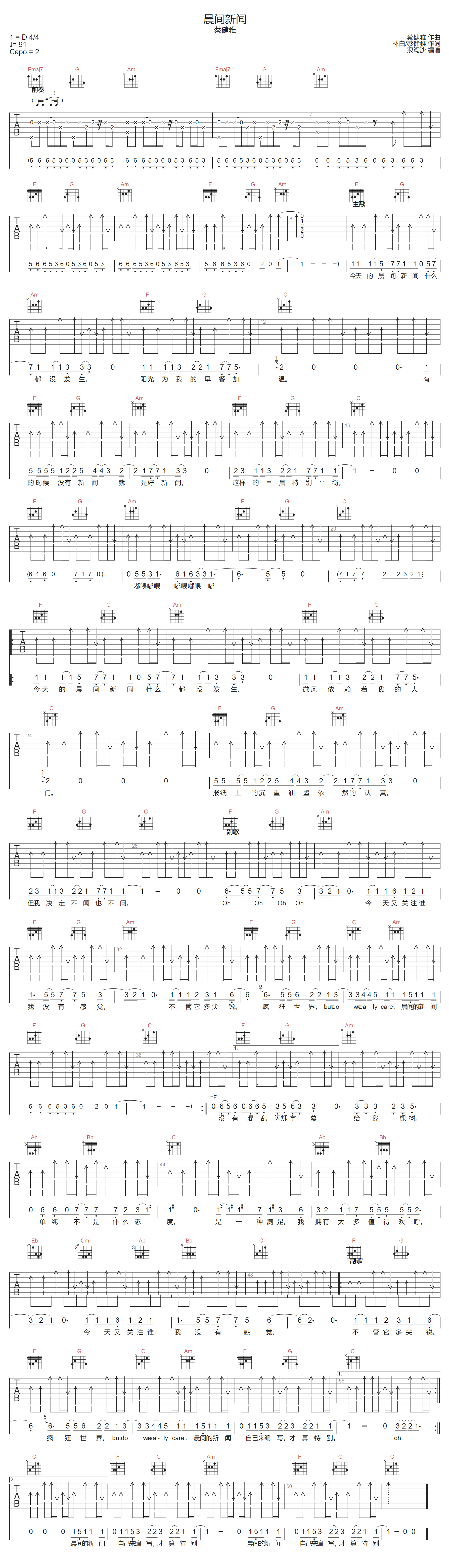 《蔡健雅《晨间新闻吉他谱》(C调)》内容来自于互联网,不能保证内容的准确性与完整性,仅供学习交流欣赏,请勿用于其它用途,内容版权归原作者及来源网站所有,如有侵犯到您的权益请来信告知,我们将及时删除。