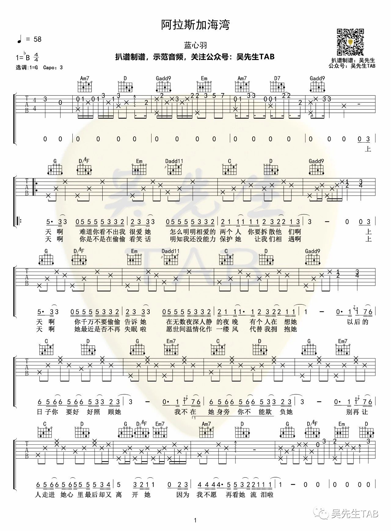 《蓝心羽《阿拉斯加海湾吉他谱》(D调)》内容来自于互联网,不能保证内容的准确性与完整性,仅供学习交流欣赏,请勿用于其它用途,内容版权归原作者及来源网站所有,如有侵犯到您的权益请来信告知,我们将及时删除。