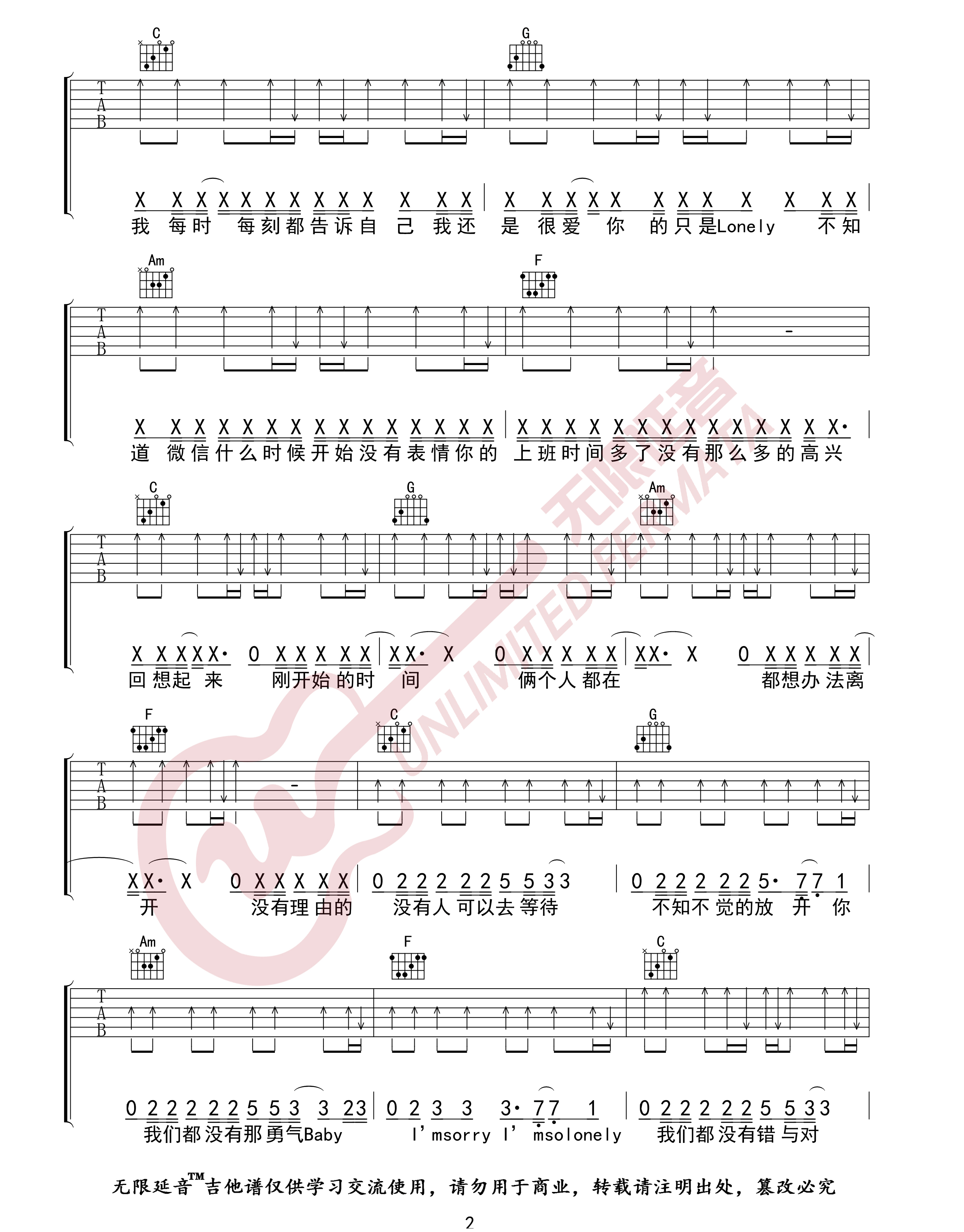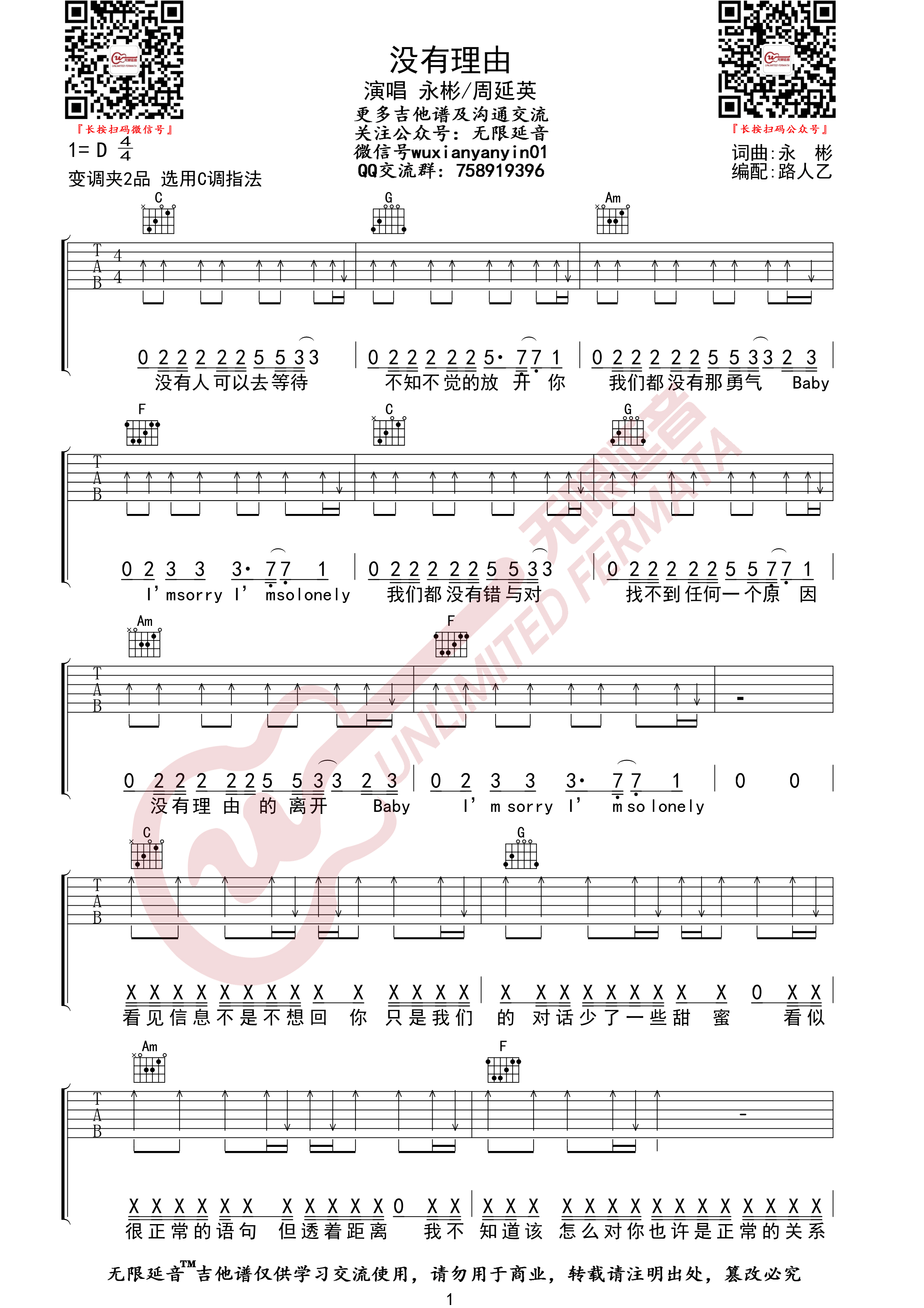 《永彬/周延英《没有理由吉他谱》(C调)》内容来自于互联网,不能保证内容的准确性与完整性,仅供学习交流欣赏,请勿用于其它用途,内容版权归原作者及来源网站所有,如有侵犯到您的权益请来信告知,我们将及时删除。