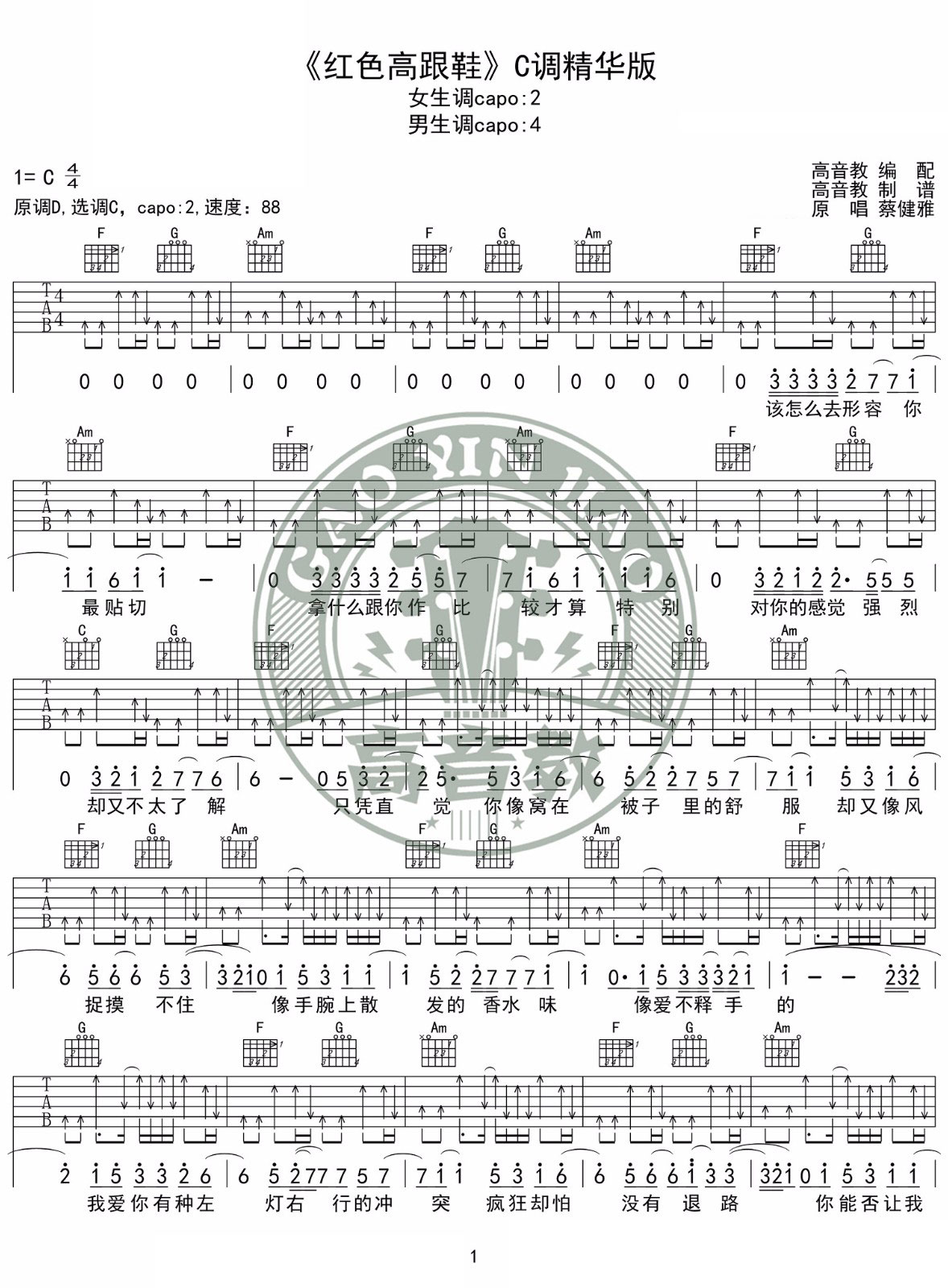 《蔡健雅《红色高跟鞋吉他谱》(C调)》内容来自于互联网,不能保证内容的准确性与完整性,仅供学习交流欣赏,请勿用于其它用途,内容版权归原作者及来源网站所有,如有侵犯到您的权益请来信告知,我们将及时删除。