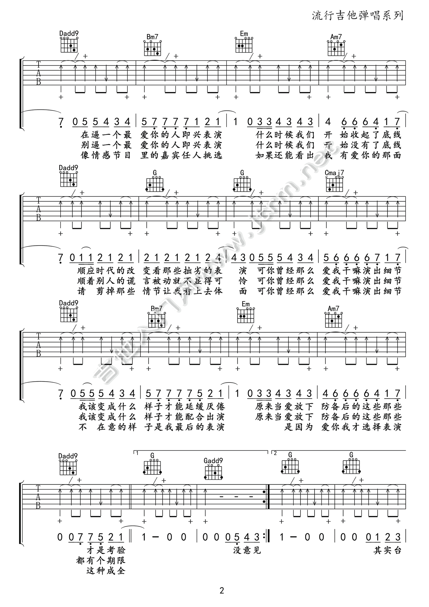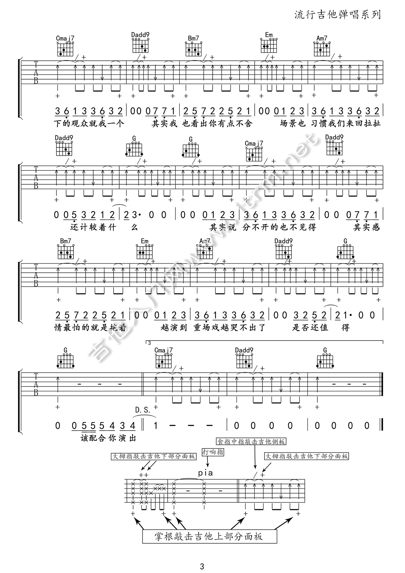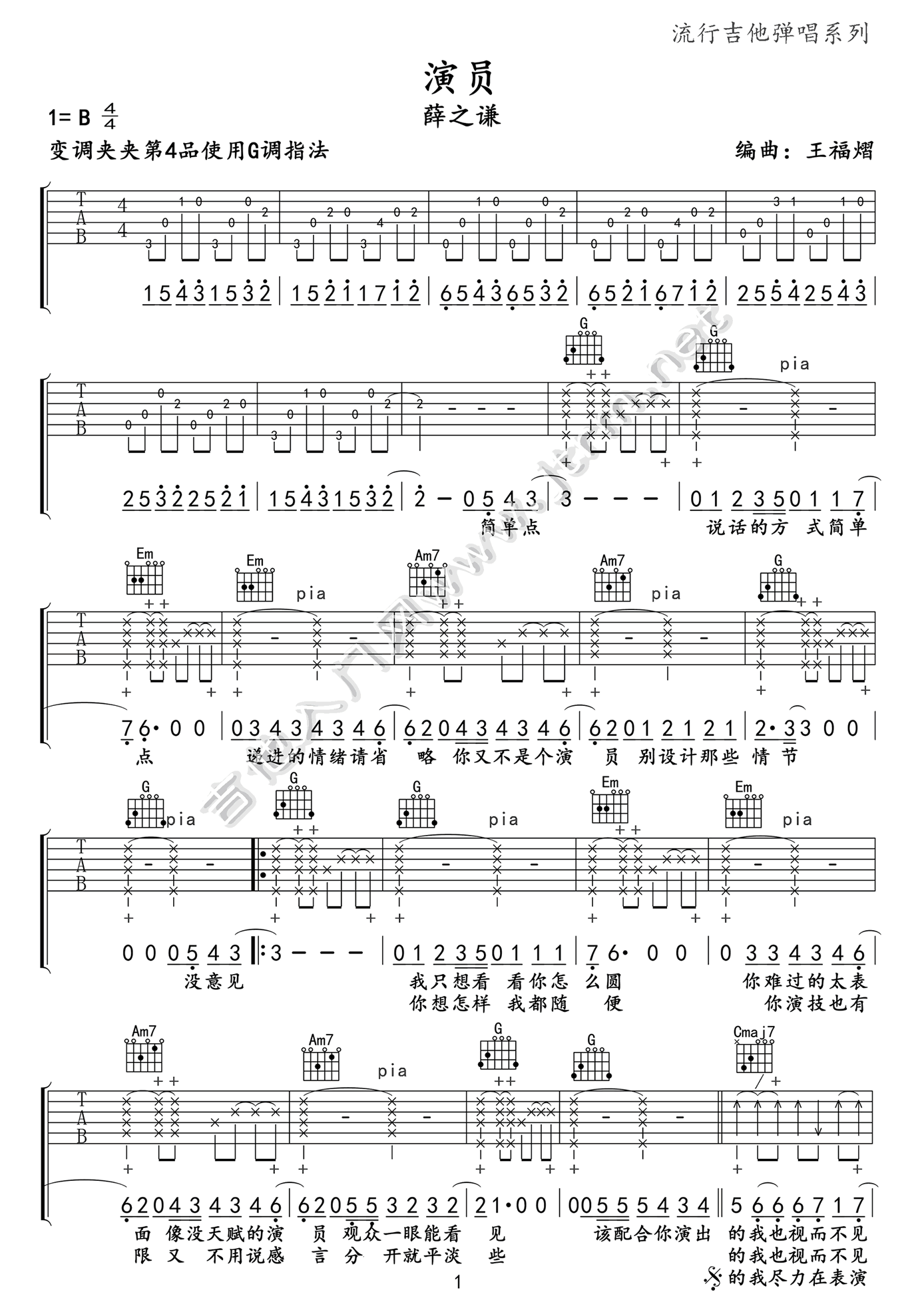 《薛之谦《演员吉他谱》(G调)》内容来自于互联网,不能保证内容的准确性与完整性,仅供学习交流欣赏,请勿用于其它用途,内容版权归原作者及来源网站所有,如有侵犯到您的权益请来信告知,我们将及时删除。