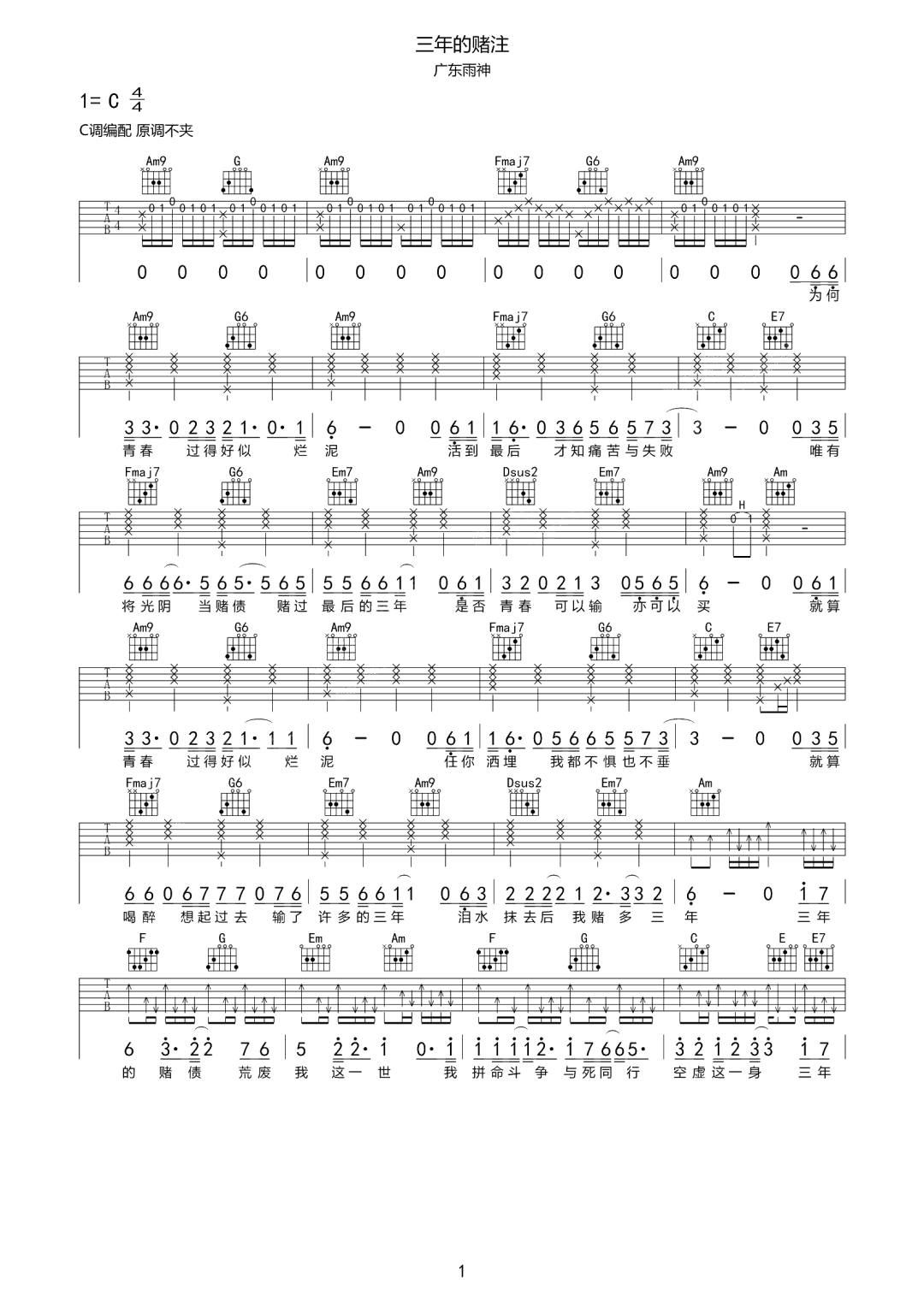 广东雨神《三年的赌注吉他谱》(G调)