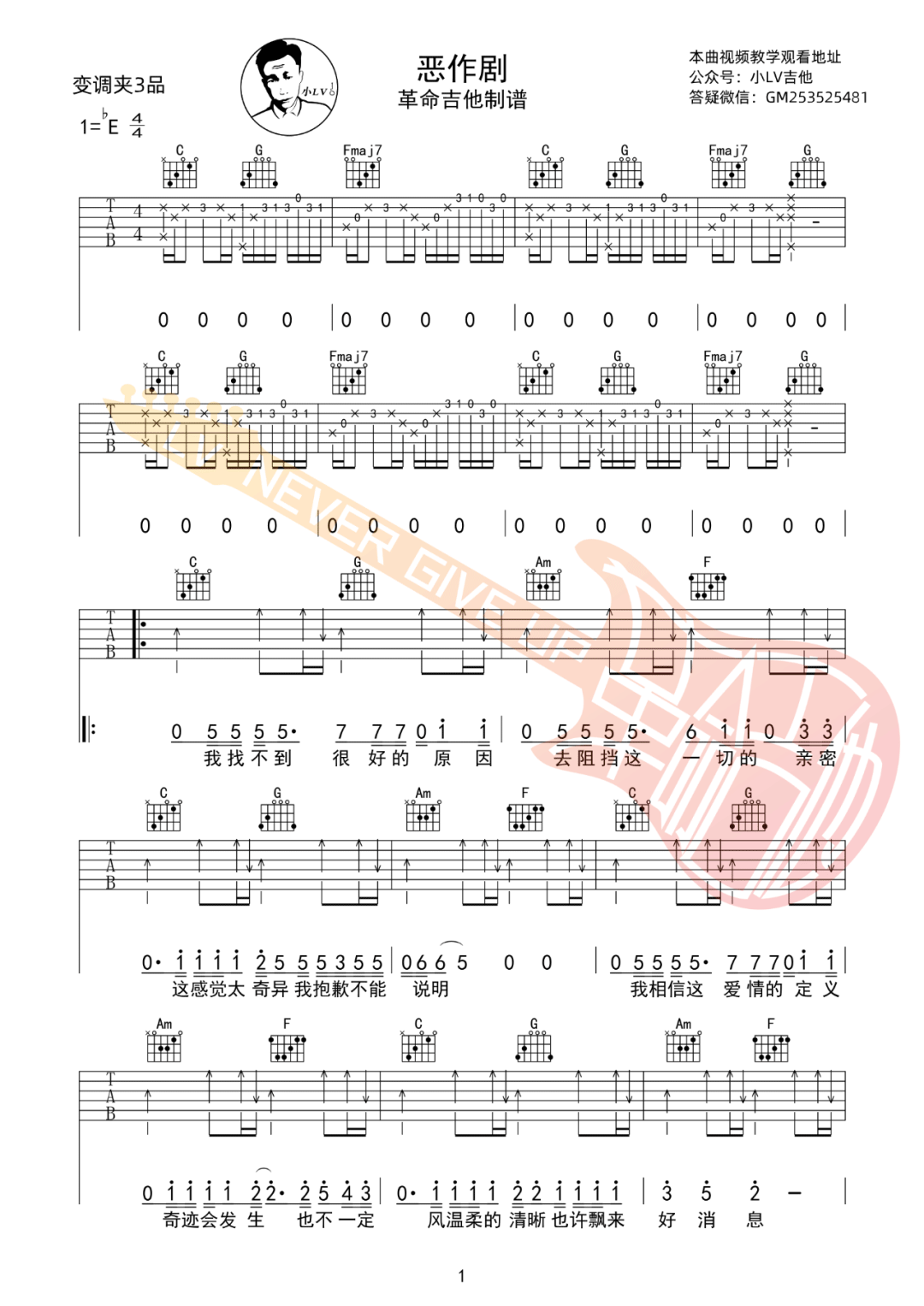 《王蓝茵《恶作剧吉他谱》(C调)》内容来自于互联网,不能保证内容的准确性与完整性,仅供学习交流欣赏,请勿用于其它用途,内容版权归原作者及来源网站所有,如有侵犯到您的权益请来信告知,我们将及时删除。