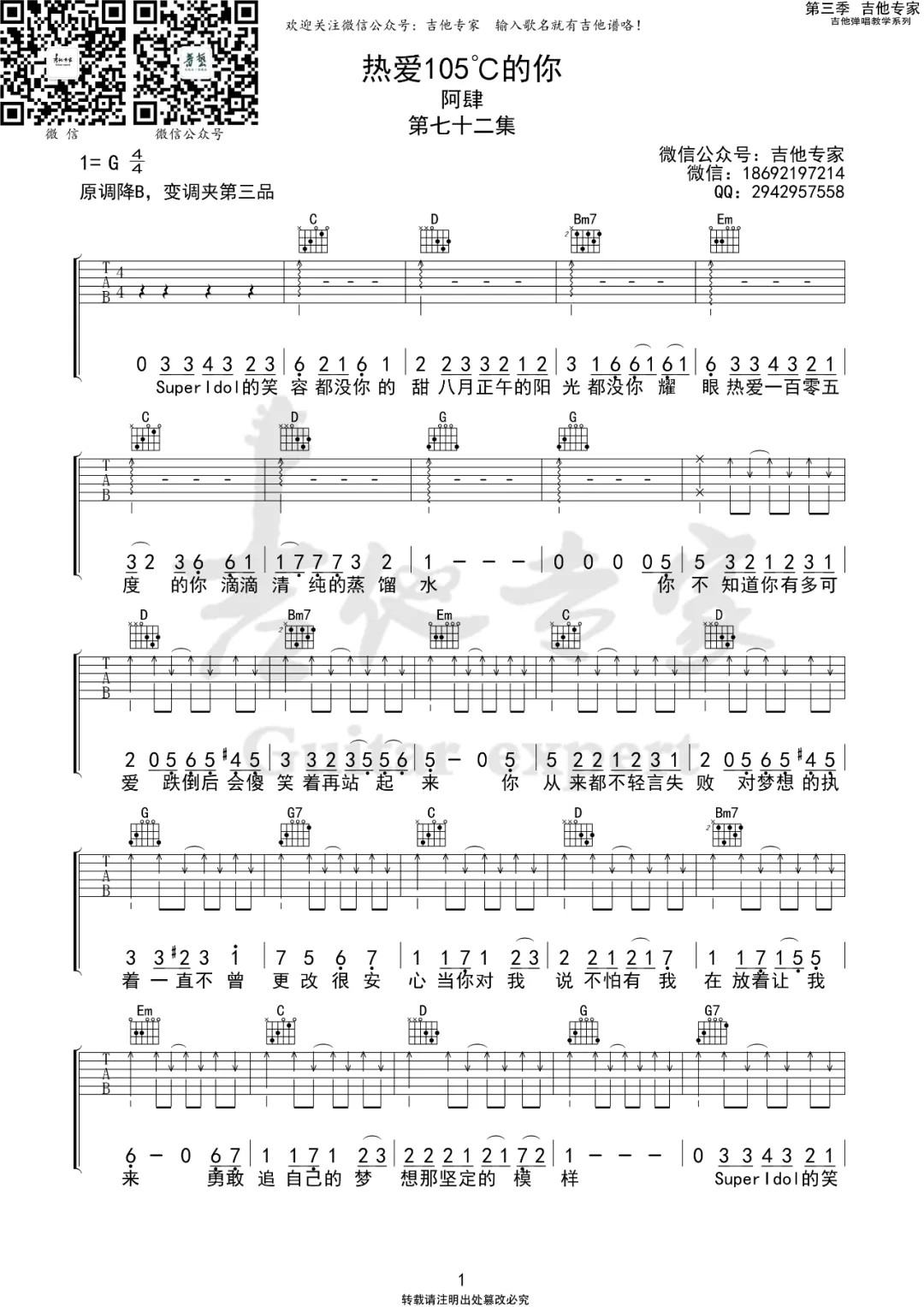 《阿肆《热爱105度的你吉他谱》(G调)》内容来自于互联网,不能保证内容的准确性与完整性,仅供学习交流欣赏,请勿用于其它用途,内容版权归原作者及来源网站所有,如有侵犯到您的权益请来信告知,我们将及时删除。