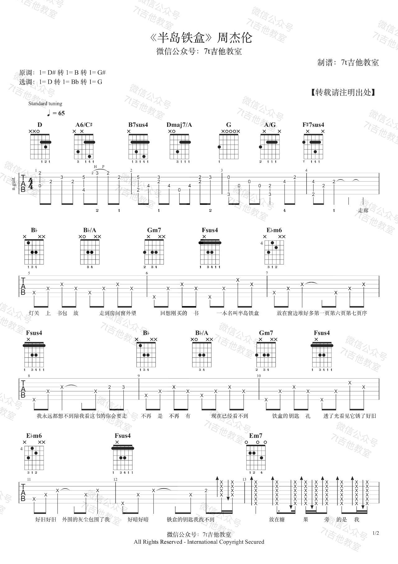 《周杰伦《半岛铁盒吉他谱》(A调)》内容来自于互联网,不能保证内容的准确性与完整性,仅供学习交流欣赏,请勿用于其它用途,内容版权归原作者及来源网站所有,如有侵犯到您的权益请来信告知,我们将及时删除。