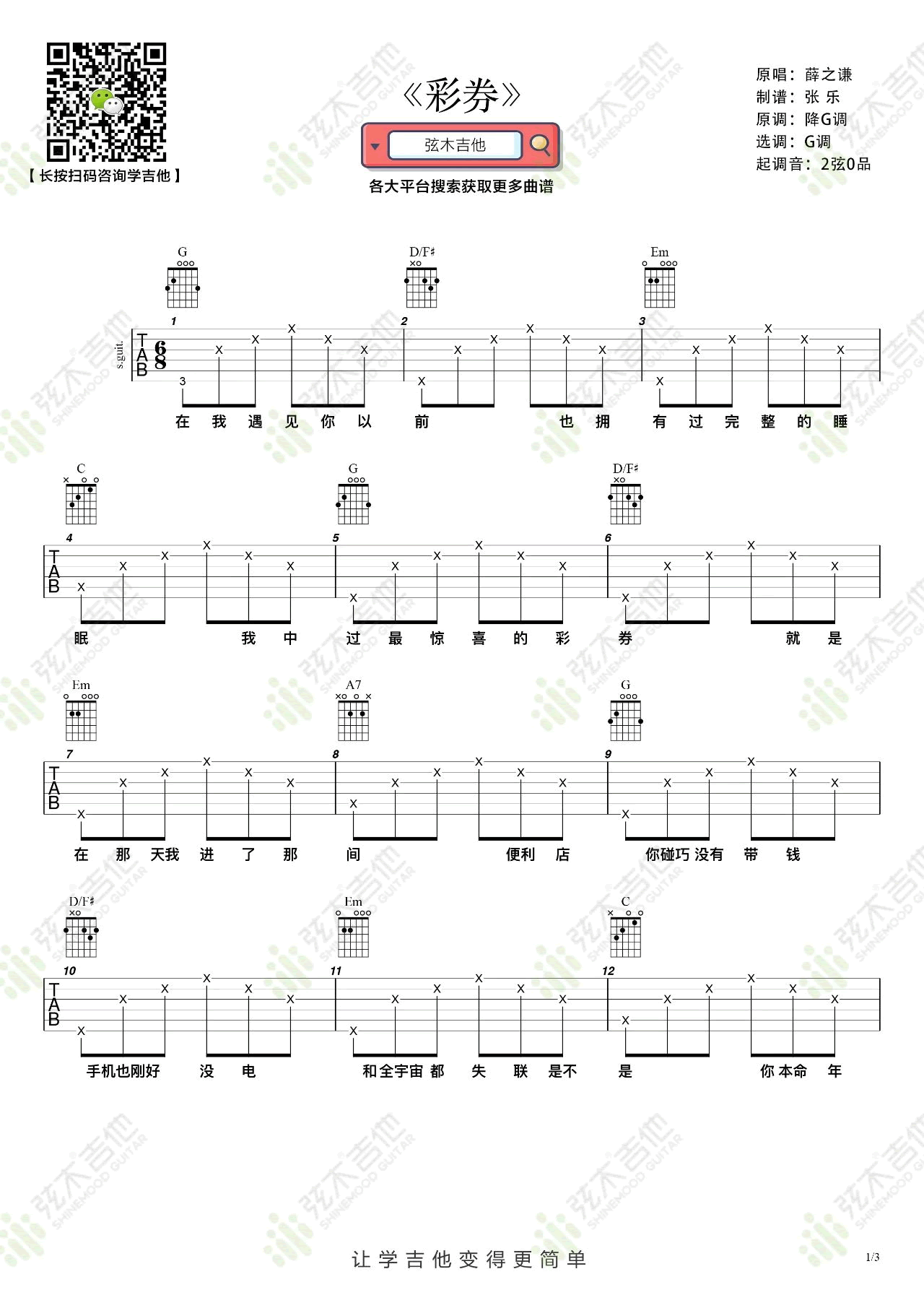 《薛之谦《彩券吉他谱》(C调)》内容来自于互联网,不能保证内容的准确性与完整性,仅供学习交流欣赏,请勿用于其它用途,内容版权归原作者及来源网站所有,如有侵犯到您的权益请来信告知,我们将及时删除。