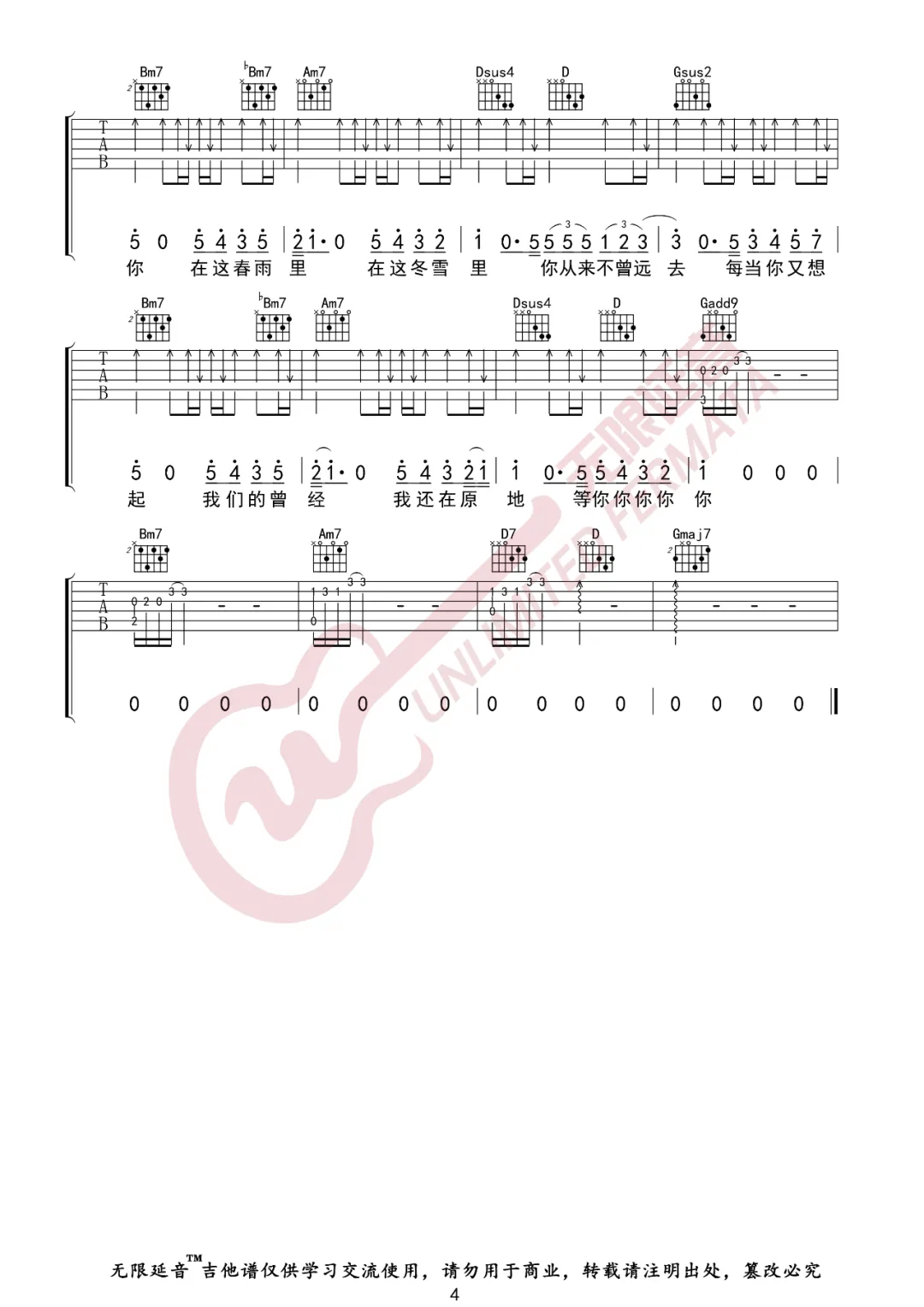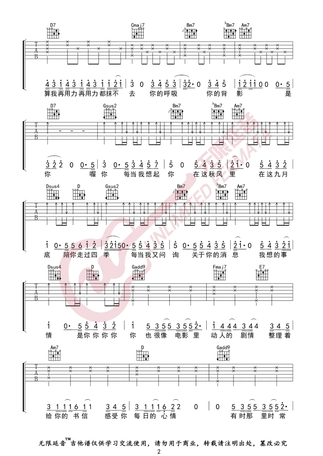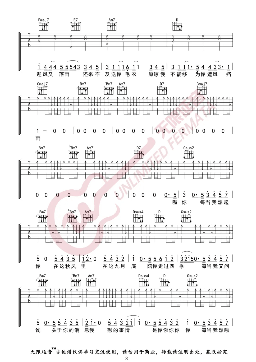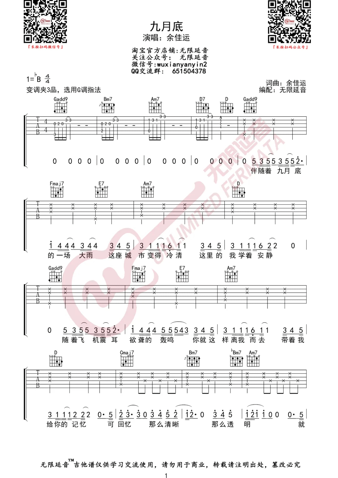 《余佳运《九月底吉他谱》(D调)》内容来自于互联网,不能保证内容的准确性与完整性,仅供学习交流欣赏,请勿用于其它用途,内容版权归原作者及来源网站所有,如有侵犯到您的权益请来信告知,我们将及时删除。