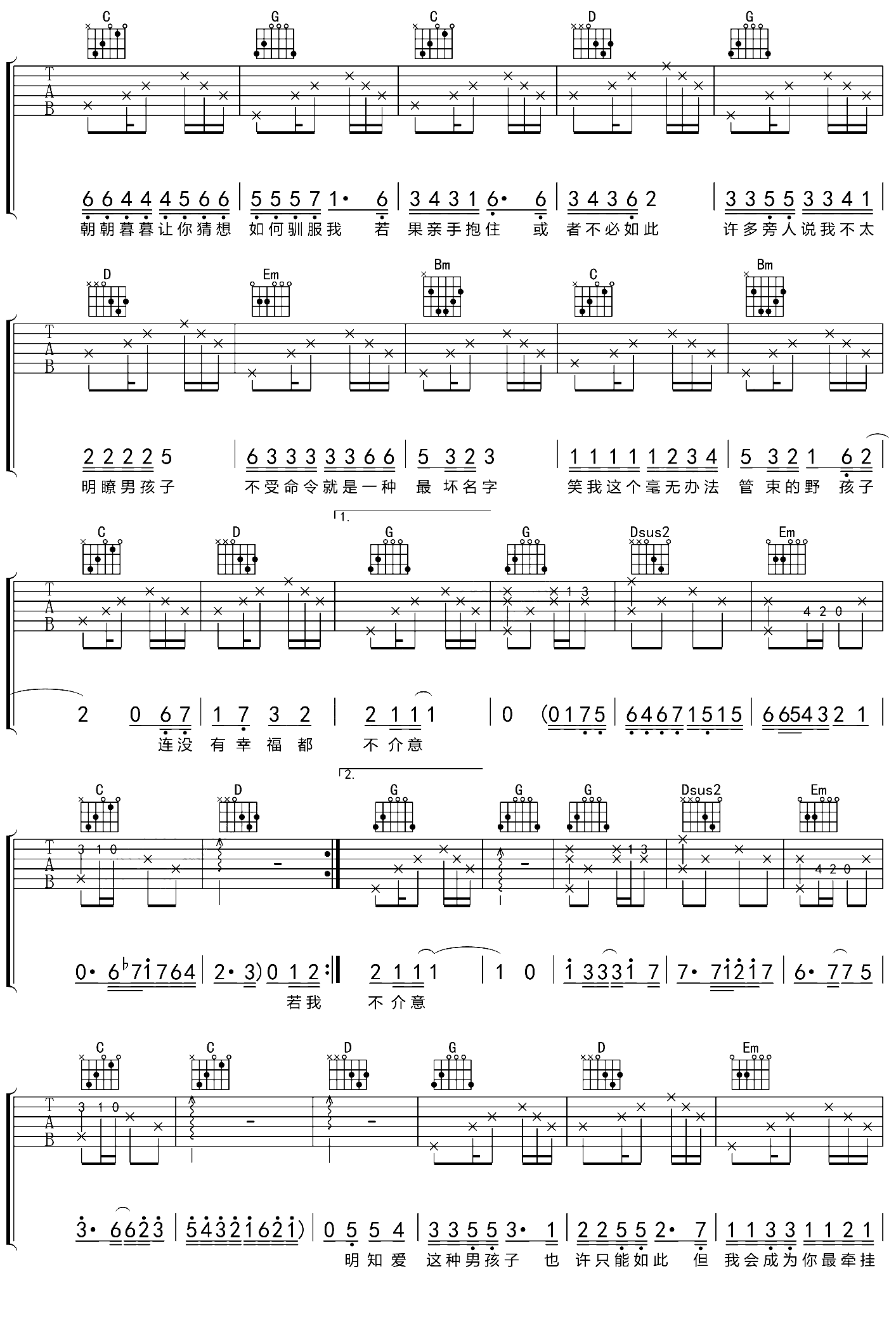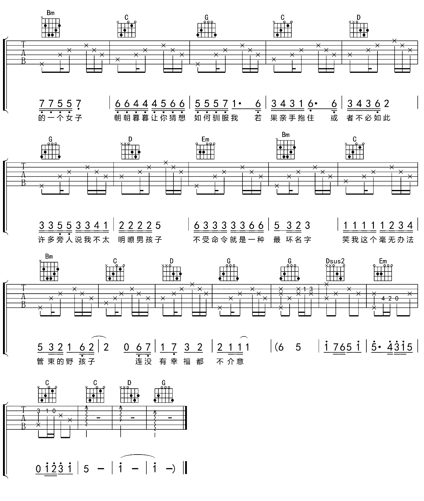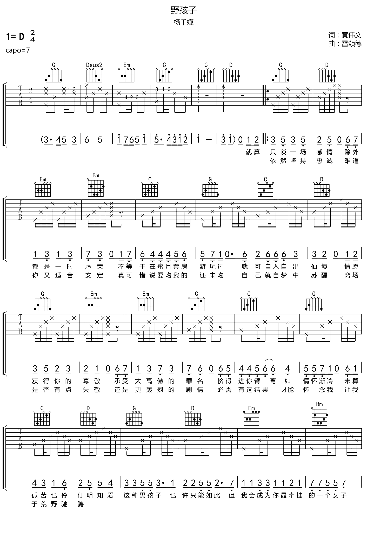 《杨千嬅《野孩子吉他谱》(C调)》内容来自于互联网,不能保证内容的准确性与完整性,仅供学习交流欣赏,请勿用于其它用途,内容版权归原作者及来源网站所有,如有侵犯到您的权益请来信告知,我们将及时删除。