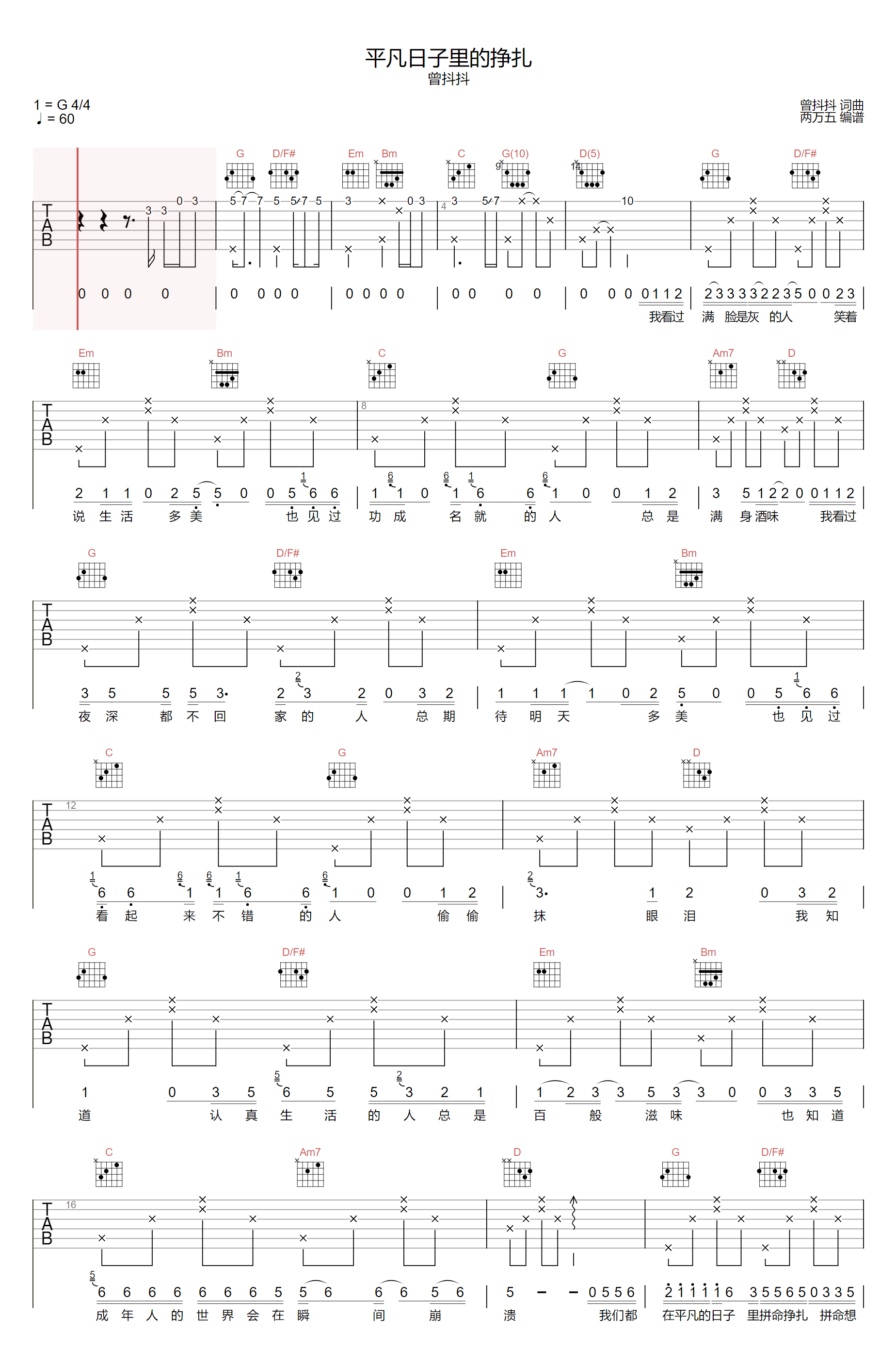 《曾抖抖《平凡日子里的挣扎吉他谱》(G调)》内容来自于互联网,不能保证内容的准确性与完整性,仅供学习交流欣赏,请勿用于其它用途,内容版权归原作者及来源网站所有,如有侵犯到您的权益请来信告知,我们将及时删除。