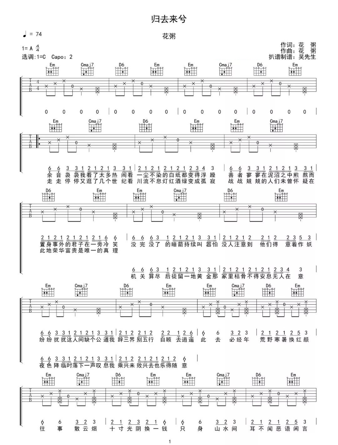 《花粥《归去来兮吉他谱》》内容来自于互联网,不能保证内容的准确性与完整性,仅供学习交流欣赏,请勿用于其它用途,内容版权归原作者及来源网站所有,如有侵犯到您的权益请来信告知,我们将及时删除。